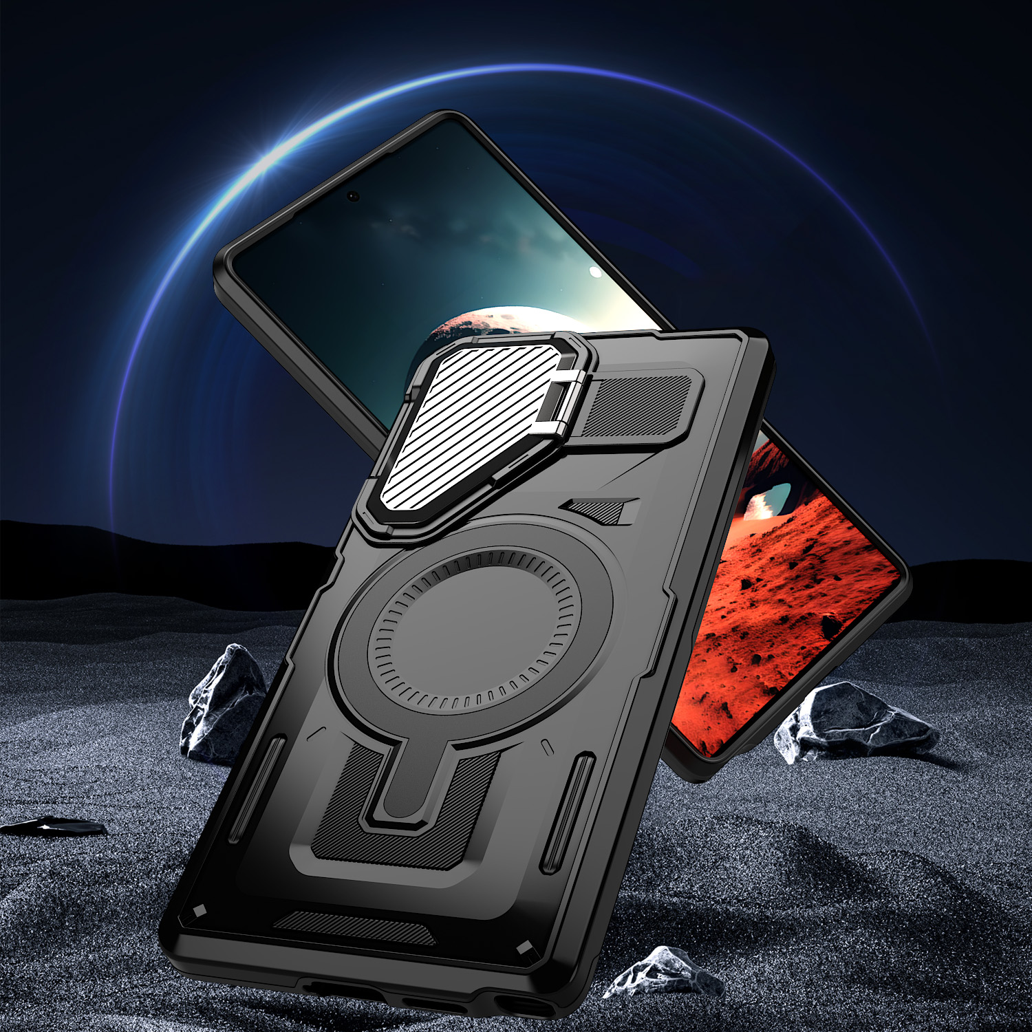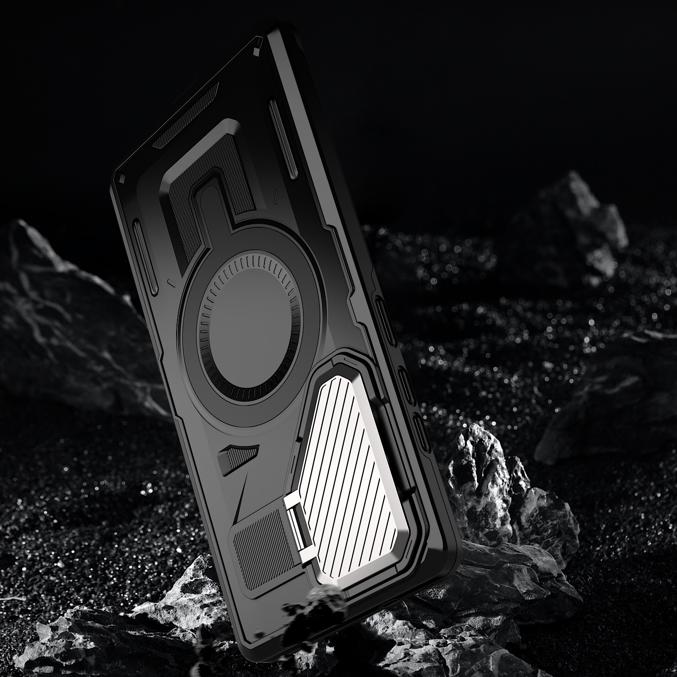 Etui ARMOR MAG to akcesorium, które zapewnia wysoki poziom ochrony połączony z nowoczesnym designem. Wykonane z wysokiej jakości materiałów, które skutecznie chronią Twój telefon przed uderzeniami, zadrapaniami, upadkami i innymi uszkodzeniami mechanicznymi. Innowacyjna, metalowa osłona na aparaty, wyściełana miękką mikrofibrą, gwarantuje dodatkową ochronę soczewek aparatu przed zarysowaniami i kurzem. Zamykanie osłony na bok zapewnia szybki dostęp, kiedy tylko potrzeba zrobić zdjęcie lub nagrać film. Dodatkowo służy ona także za wygodną podstawkę, pozwalając na korzystanie z telefonu w pozycji poziomej. Wbudowany pierścień MagSafe umożliwia szybkie i pewne mocowanie akcesoriów kompatybilnych z tą technologią, takich jak ładowarki (działa tylko z telefonami obsługującymi ładowanie indukcyjne), portfele czy uchwyty samochodowe. Metalowe elementy wbudowane w etui są odpowiednio rozmieszczone, by zapewnić idealne dopasowanie i stabilność montowanych dodatków. Pierścień MagSafe nie wpływa na codzienne użytkowanie, a same akcesoria można łatwo i szybko doczepić oraz zdemontować.
