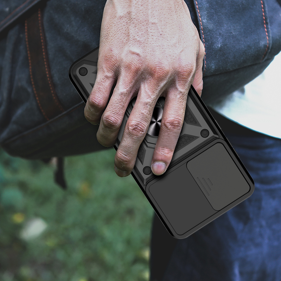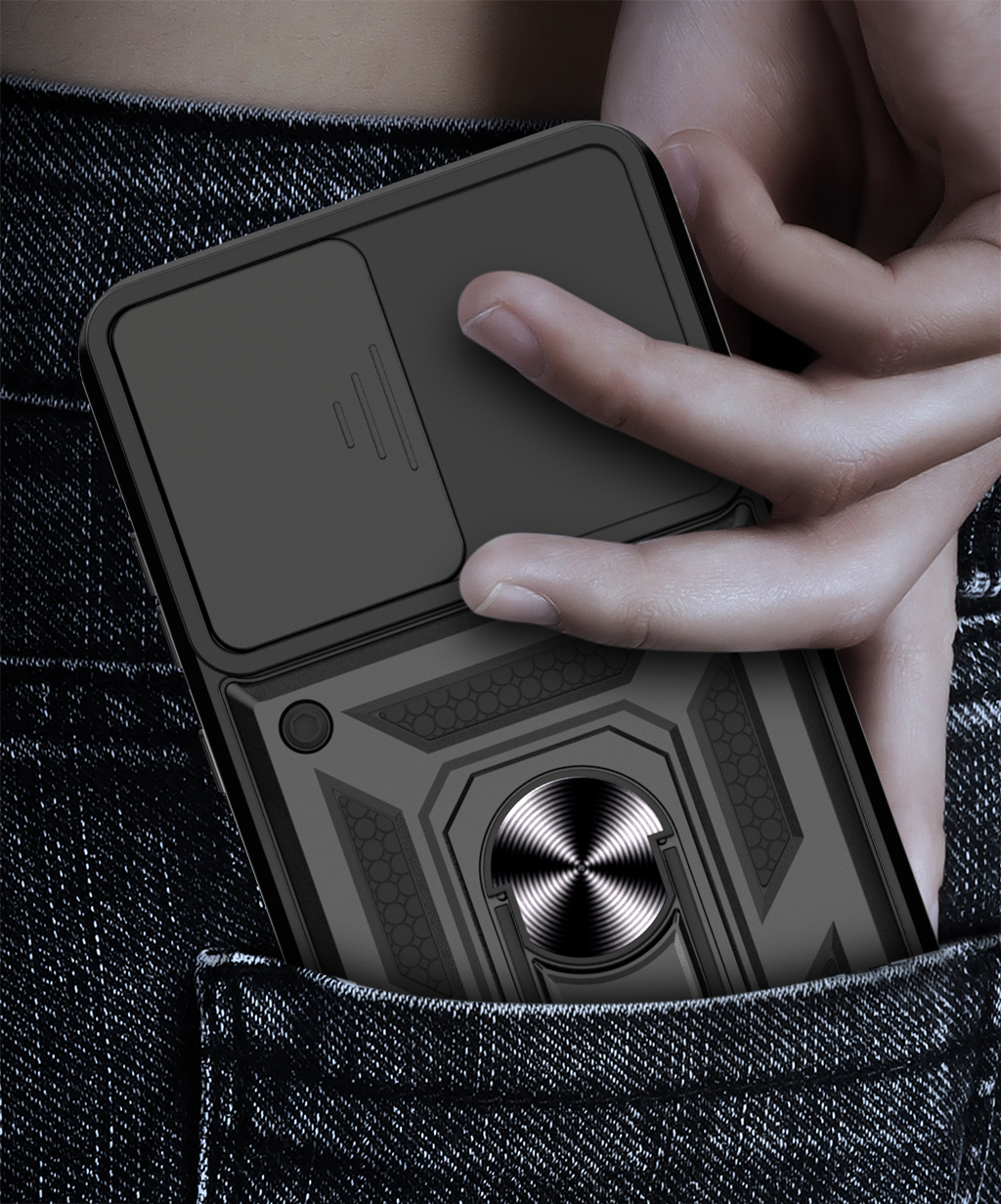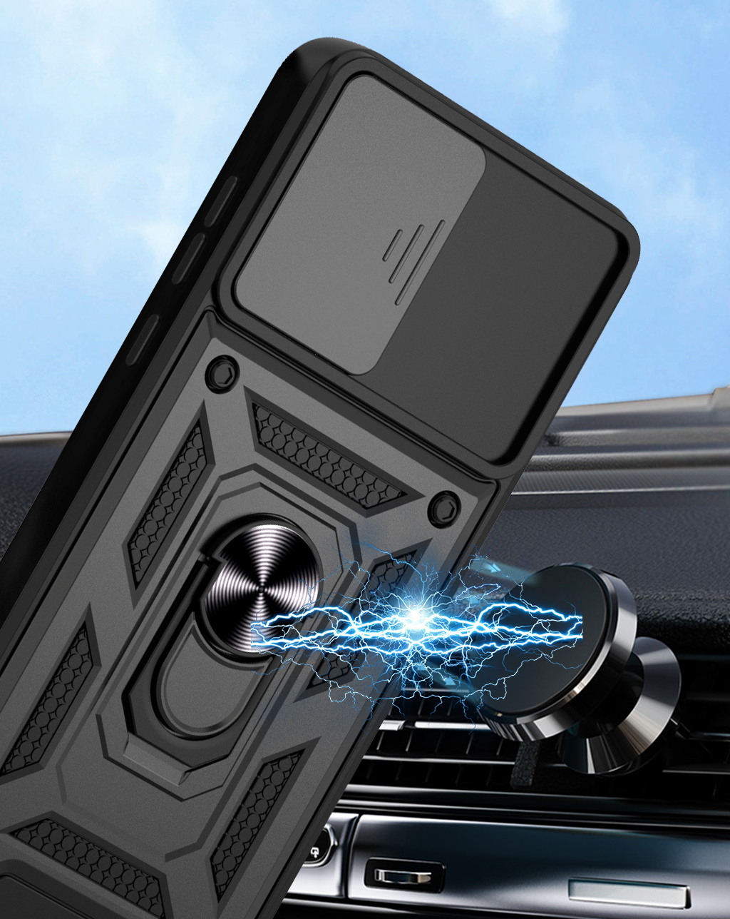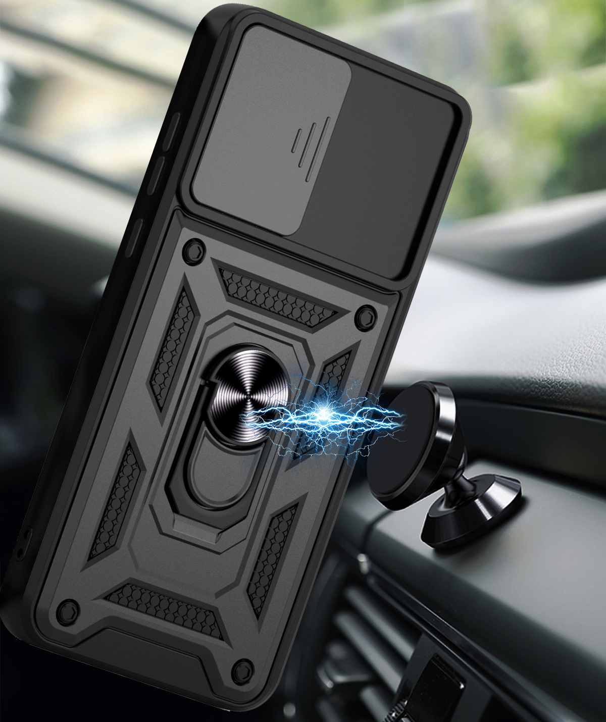 CAMSHIELD to etui, które zapewnia wysoki poziom ochrony połączony z nowoczesnym designem. Dwuwarstwowa konstrukcja z twardego poliwęglanu i elastycznego TPU to większa ochrona przed upadkami, zarysowaniami i codziennym zużyciem. Przesuwana osłona aparatu zabezpiecza soczewki przed uszkodzeniami i zabrudzeniami. Znajdujący się na pleckach metalowy ring z blaszką, pełni funkcję podstawki, uchwytu do wygodnego trzymania oraz mocowania do uchwytów magnetycznych w samochodzie. Zintegrowane przyciski chronią newralgiczne elementy telefonu, zachowując jednocześnie pełną funkcjonalność i wygodę użytkowania. Dodatkowo etui posiada dwie małe dziurki, umożliwiające przyczepienie smyczy lub zawieszki. To praktyczne rozwiązanie, które sprawdzi się zarówno na co dzień, jak i podczas wycieczek czy podróży.