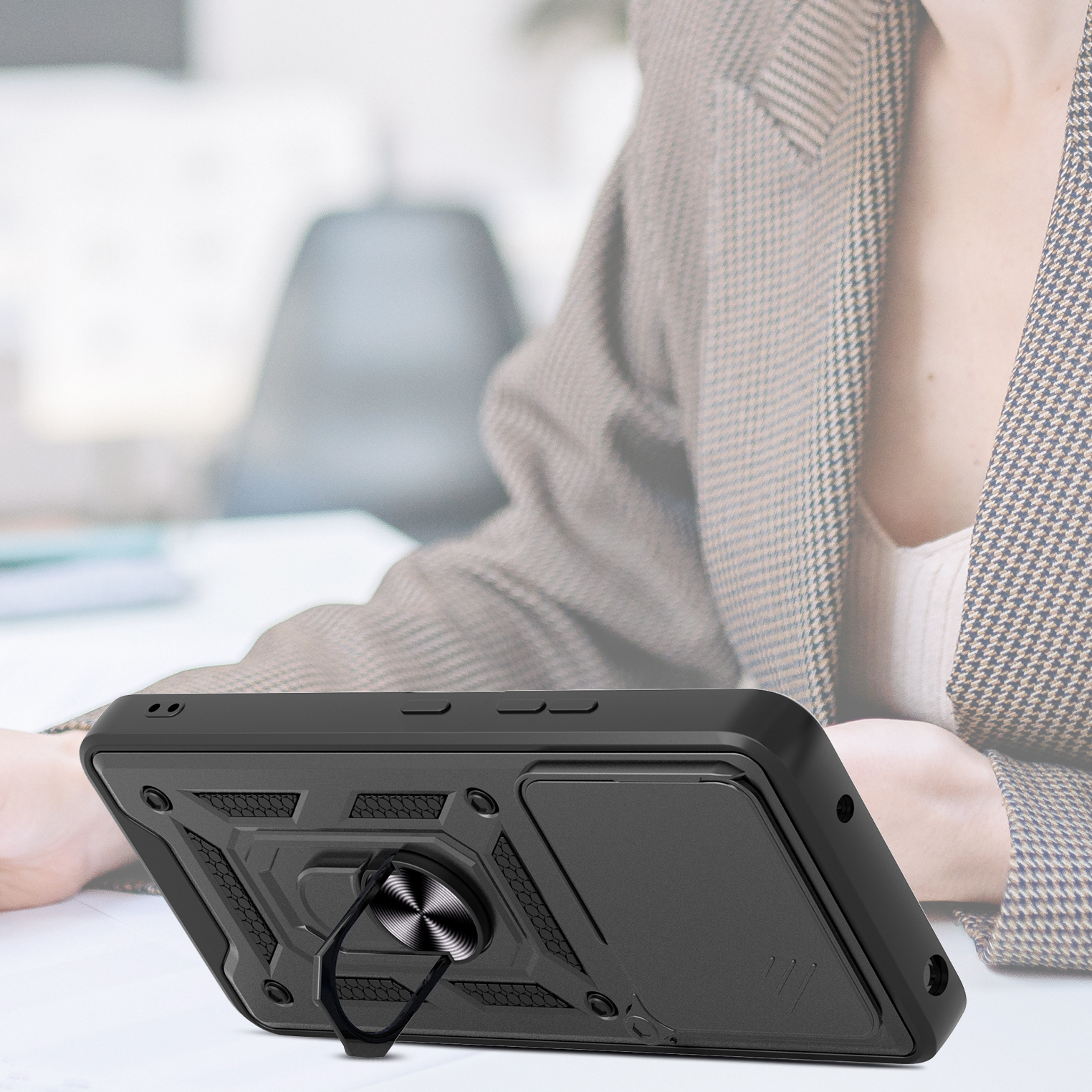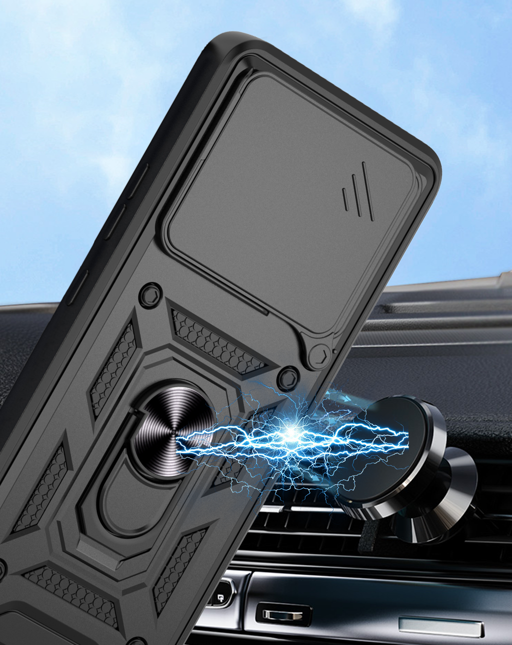 CAMSHIELD to etui, które zapewnia wysoki poziom ochrony połączony z nowoczesnym designem. Dwuwarstwowa konstrukcja z twardego poliwęglanu i elastycznego TPU to większa ochrona przed upadkami, zarysowaniami i codziennym zużyciem. Przesuwana osłona aparatu zabezpiecza soczewki przed uszkodzeniami i zabrudzeniami. Znajdujący się na pleckach metalowy ring z blaszką, pełni funkcję podstawki, uchwytu do wygodnego trzymania oraz mocowania do uchwytów magnetycznych w samochodzie. Zintegrowane przyciski chronią newralgiczne elementy telefonu, zachowując jednocześnie pełną funkcjonalność i wygodę użytkowania. Dodatkowo etui posiada dwie małe dziurki, umożliwiające przyczepienie smyczy lub zawieszki. To praktyczne rozwiązanie, które sprawdzi się zarówno na co dzień, jak i podczas wycieczek czy podróży.