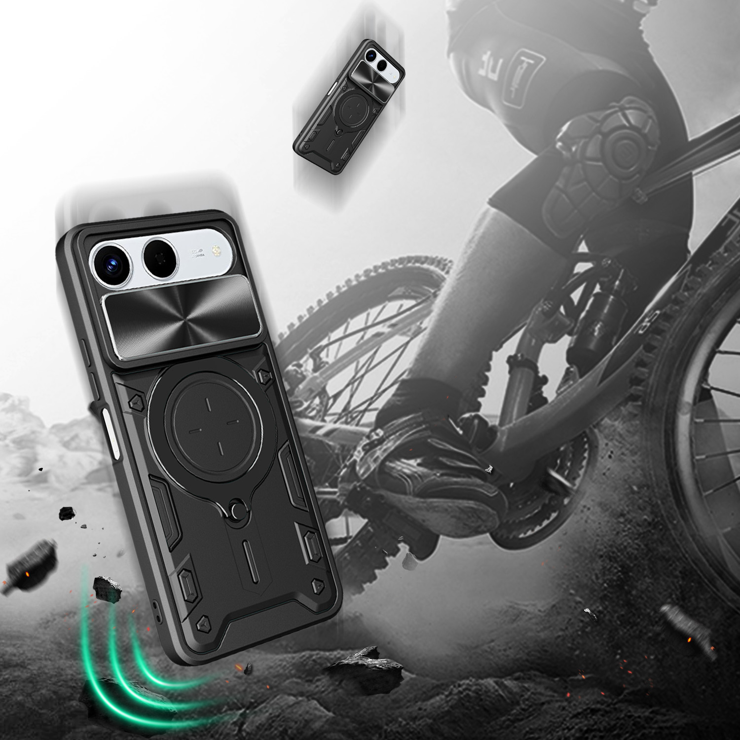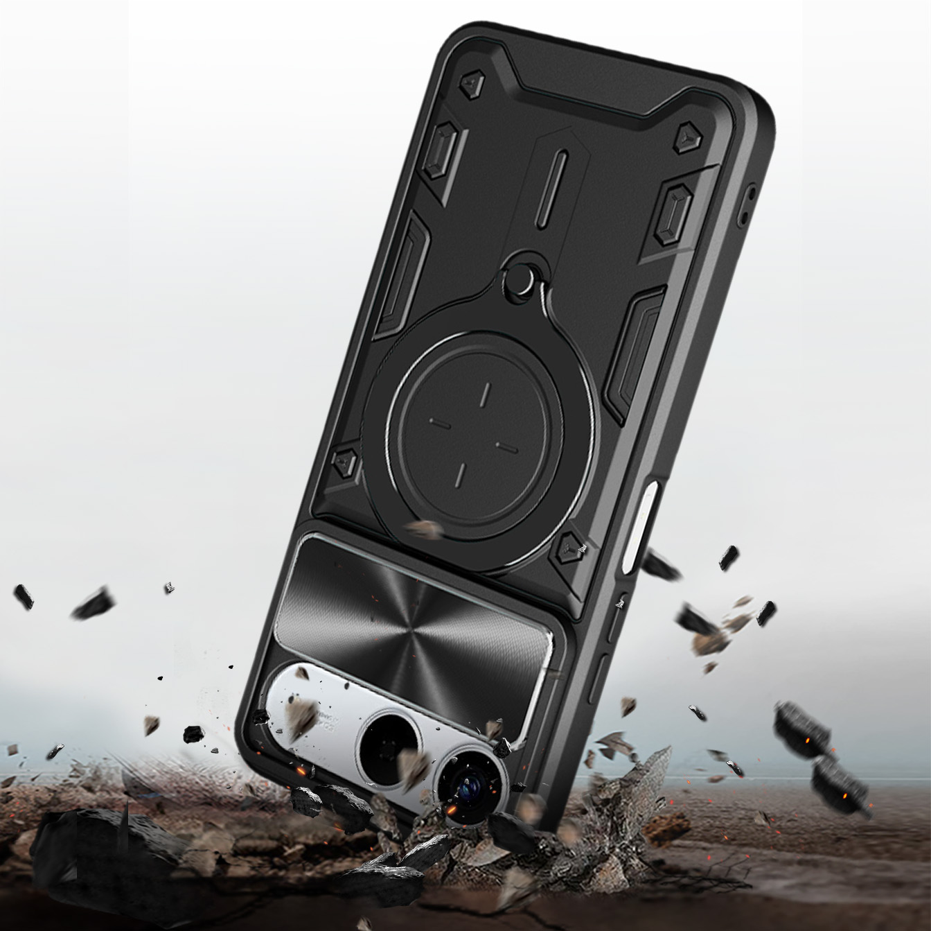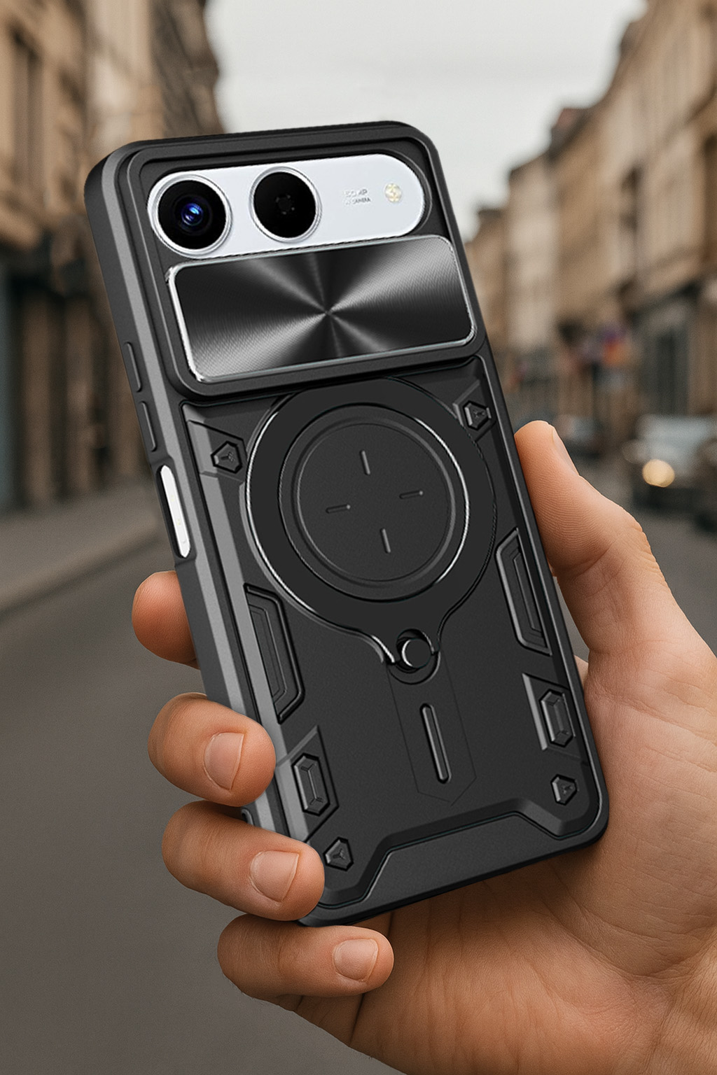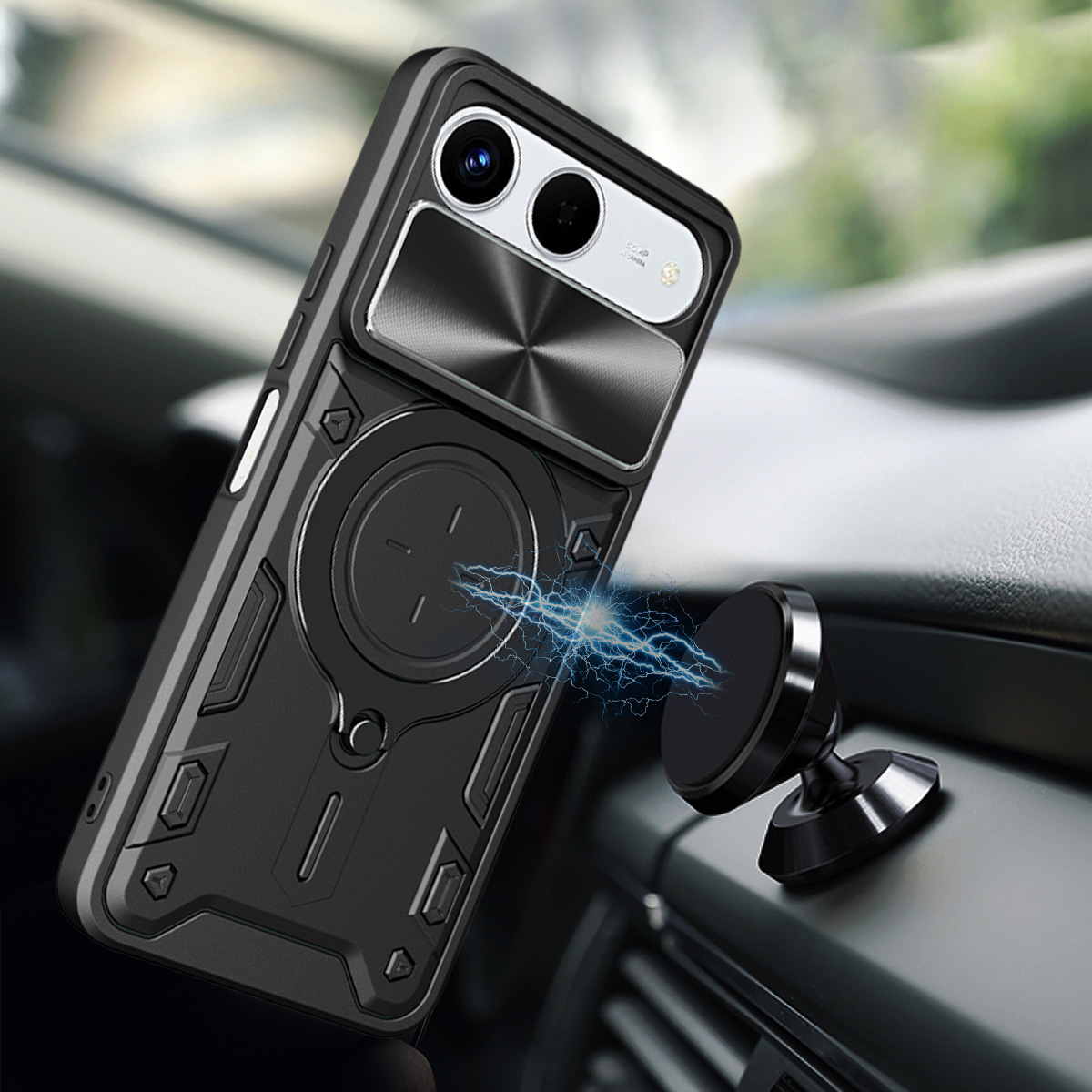 RINGSHIELD to etui, które zapewnia wysoki poziom ochrony połączony z nowoczesnym designem. Dwuwarstwowa konstrukcja z twardego poliwęglanu i elastycznego TPU zwiększa ochronę przed upadkami, zarysowaniami i codziennym zużyciem. Przesuwana osłona aparatu zabezpiecza soczewki przed uszkodzeniami i zabrudzeniami. Znajdujący się na pleckach metalowy ring z blaszką, pełni funkcję podstawki, uchwytu do wygodnego trzymania oraz mocowania do uchwytów magnetycznych w samochodzie. Zintegrowane przyciski chronią newralgiczne elementy telefonu, zachowując jednocześnie pełną funkcjonalność i wygodę użytkowania. Dodatkowo etui posiada dwie małe dziurki, umożliwiające przyczepienie smyczy lub zawieszki. To praktyczne rozwiązanie, które sprawdzi się zarówno na co dzień, jak i podczas wycieczek czy podróży.