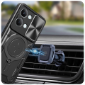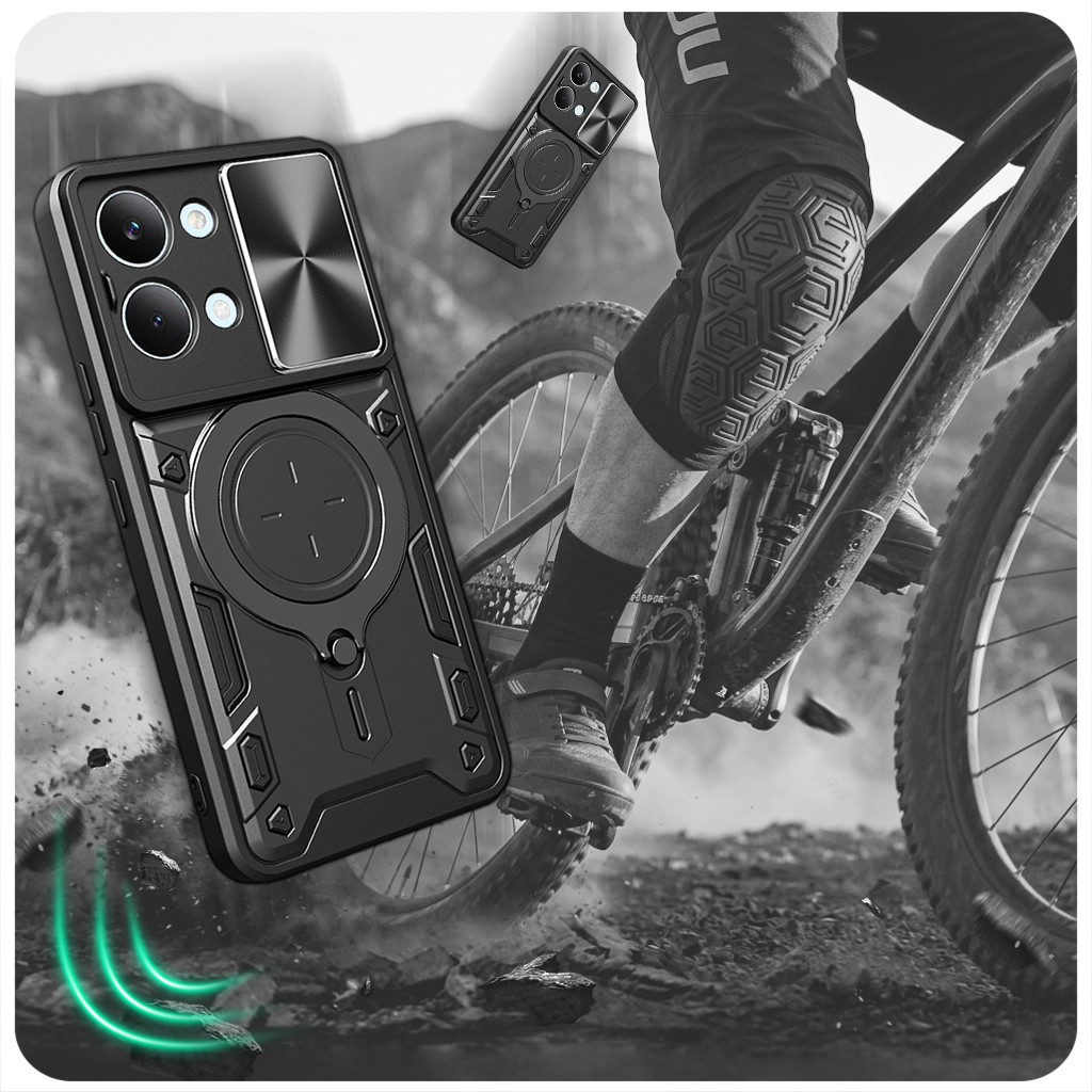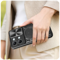 Przesuwana osłona na plecach zabezpiecza obiektywy aparatu przed zarysowaniami i zabrudzeniami. Przesuwanie działa płynnie umożliwiając szybkie odsłonięcie lub zakrycie obiektywów jednym ruchem palca. Jest to rozwiązanie, które łączy estetykę z praktyczną ochroną. Natomiast wysoki rant wokół aparatu zwiększa ochronę przy położeniu telefonu na płaskiej powierzchni lub upadku, nawet gdy osłona jest otwarta.