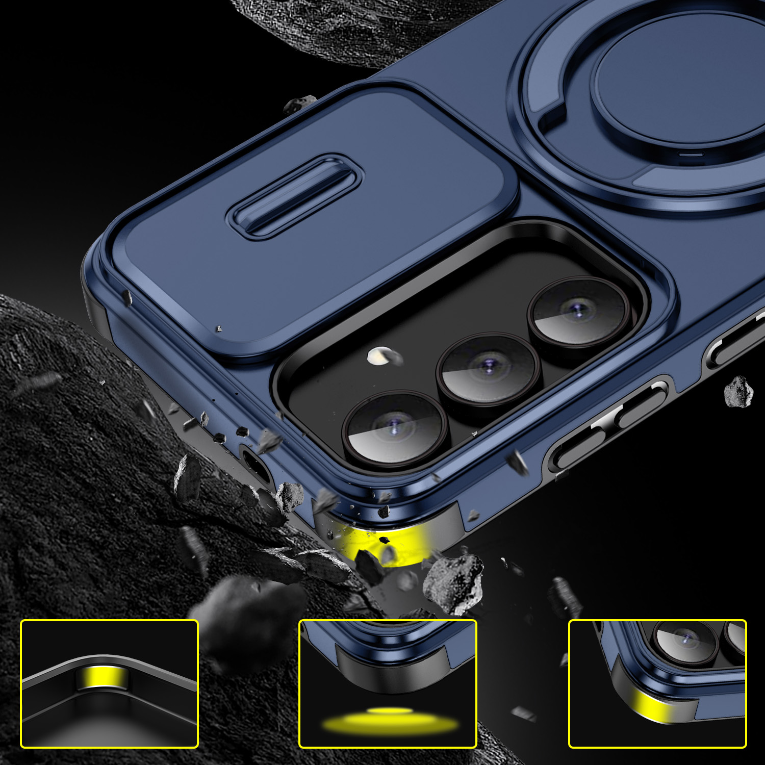 ✔️Przesuwana osłona obiektywów skutecznie chroni wyspę aparatów przed zarysowaniami, zabrudzeniami i uszkodzeniami mechanicznymi. Dzięki fizycznemu zasłonięciu obiektywów zwiększa też prywatność użytkownika. Dodatkowo stabilizuje telefon na płaskich powierzchniach, eliminując jego chwianie. Wygodny i szybki mechanizm zapewnia ochronę zawsze wtedy, gdy jest potrzebna.