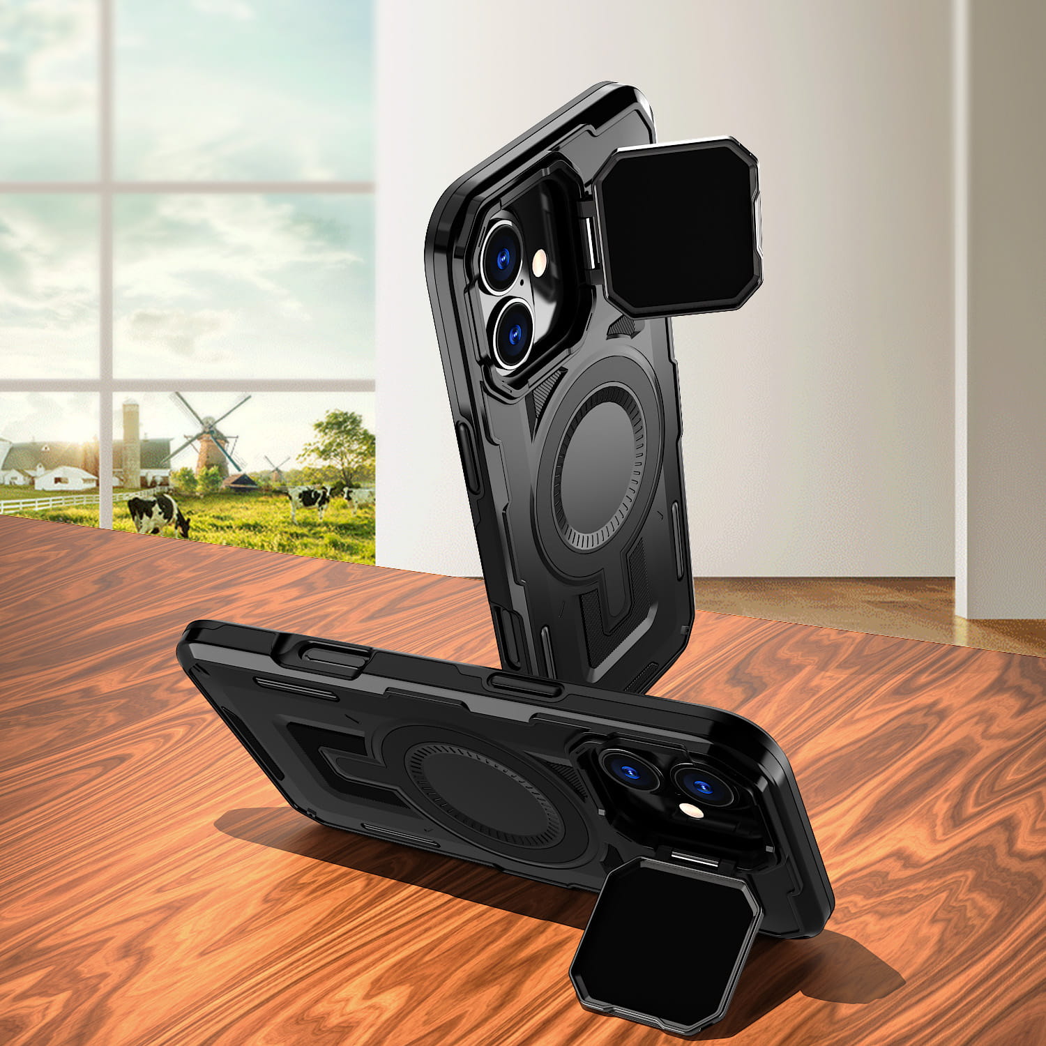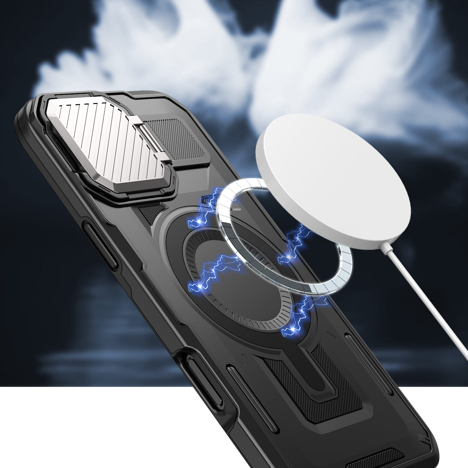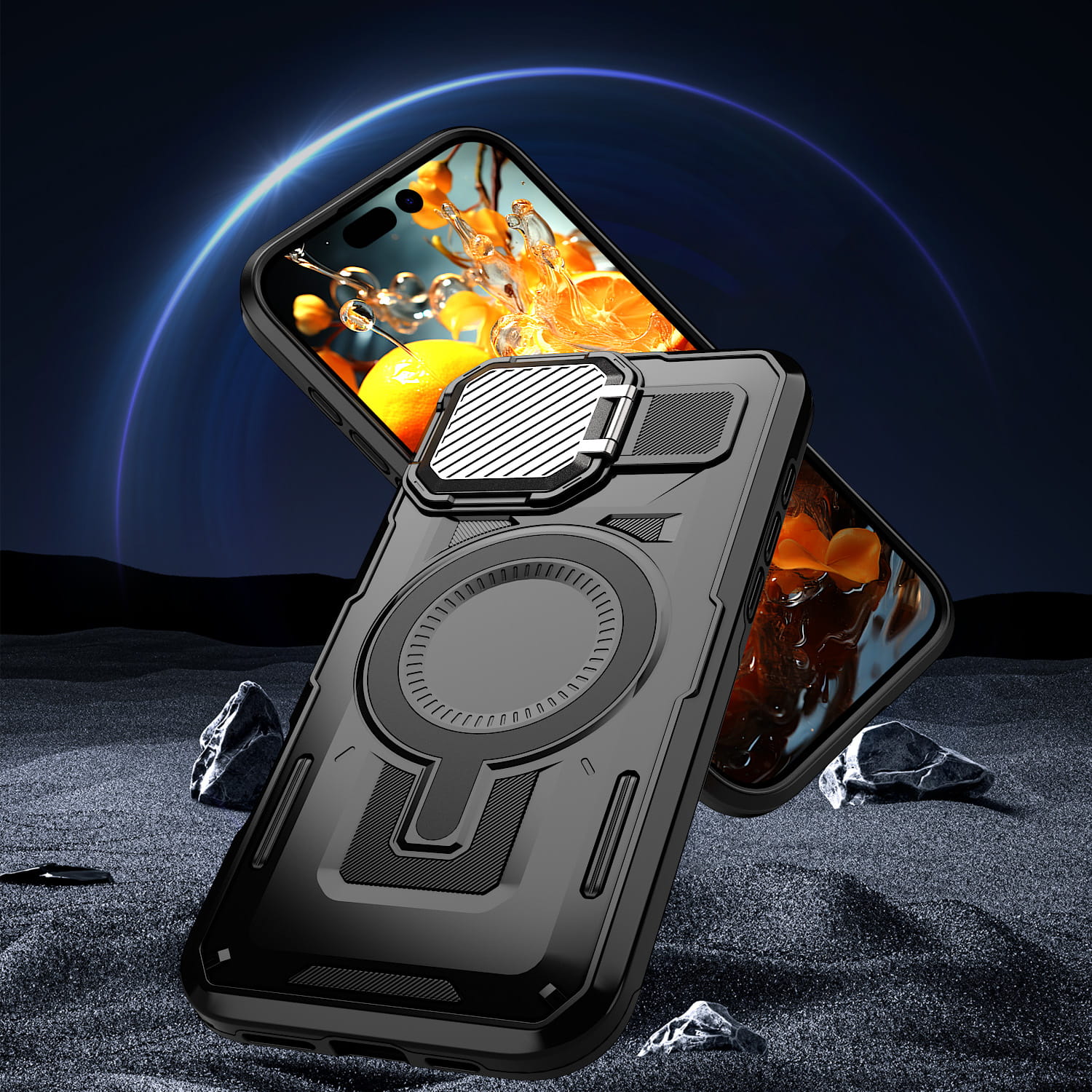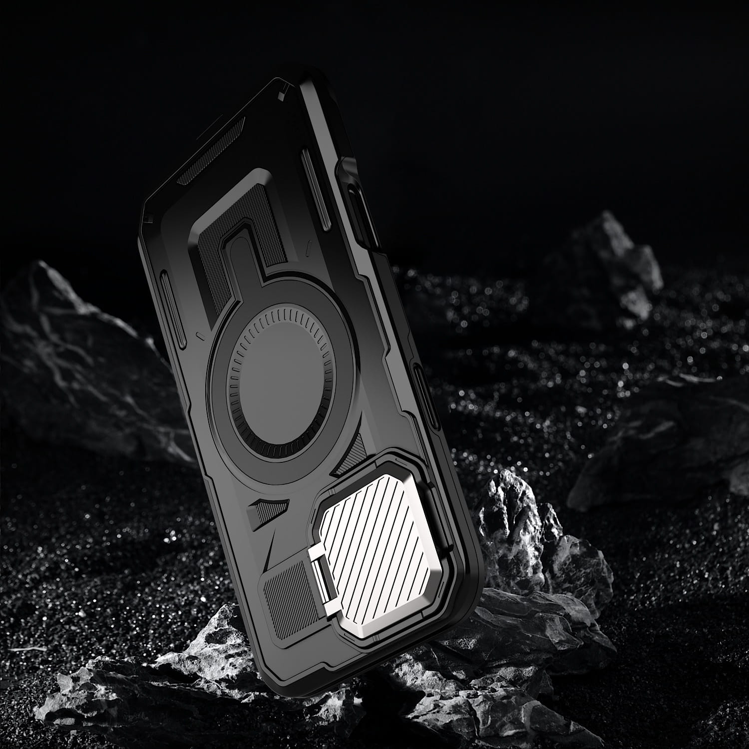 Etui ARMOR MAG to akcesorium, które zapewnia wysoki poziom ochrony połączony z nowoczesnym designem. Wykonane z wysokiej jakości materiałów, które skutecznie chronią Twój telefon przed uderzeniami, zadrapaniami, upadkami i innymi uszkodzeniami mechanicznymi. Innowacyjna, metalowa osłona na aparaty, wyściełana miękką mikrofibrą, gwarantuje dodatkową ochronę soczewek aparatu przed zarysowaniami i kurzem. Zamykanie osłony na bok zapewnia szybki dostęp, kiedy tylko potrzeba zrobić zdjęcie lub nagrać film. Dodatkowo służy ona także za wygodną podstawkę, pozwalając na korzystanie z telefonu w pozycji poziomej. Wbudowany magnetyczny pierścień MagSafe umożliwia szybkie i pewne mocowanie akcesoriów kompatybilnych z tą technologią, takich jak ładowarki (działa tylko z telefonami obsługującymi ładowanie indukcyjne), portfele czy uchwyty samochodowe. Magnesy wbudowane w etui są odpowiednio rozmieszczone, by zapewnić idealne dopasowanie i stabilność montowanych dodatków. Pierścień MagSafe nie wpływa na codzienne użytkowanie, a same akcesoria można łatwo i szybko doczepić oraz zdemontować. Etui ARMOR MAG to doskonały wybór dla osób szukających mocnego i funkcjonalnego rozwiązania, które jednocześnie wspiera technologię MagSafe, oferując kompatybilność z szeroką gamą akcesoriów.