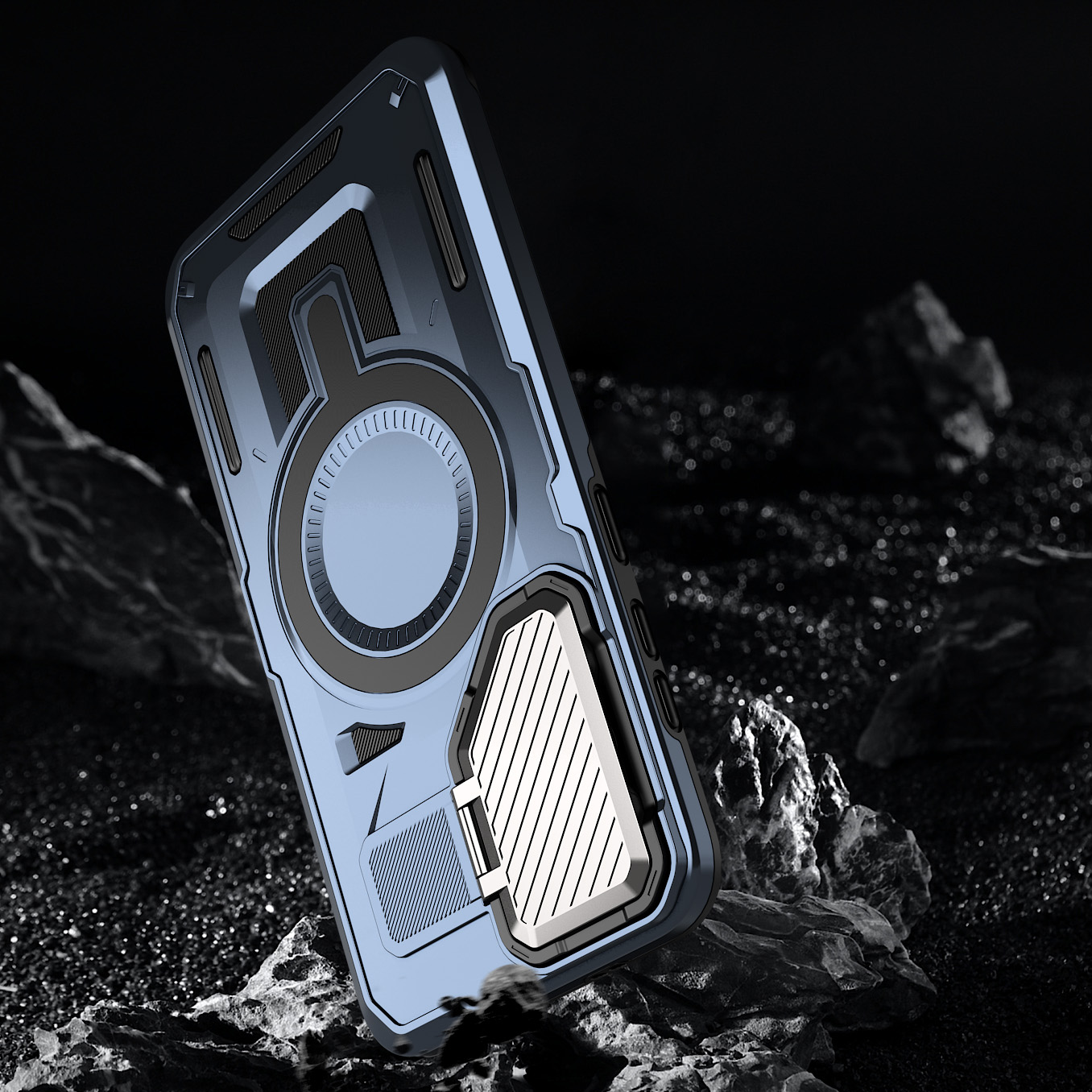 - Metalowa, wyściełana od wewnątrz mikrofibrą osłona na aparat, która pełni też funkcję podpórki.