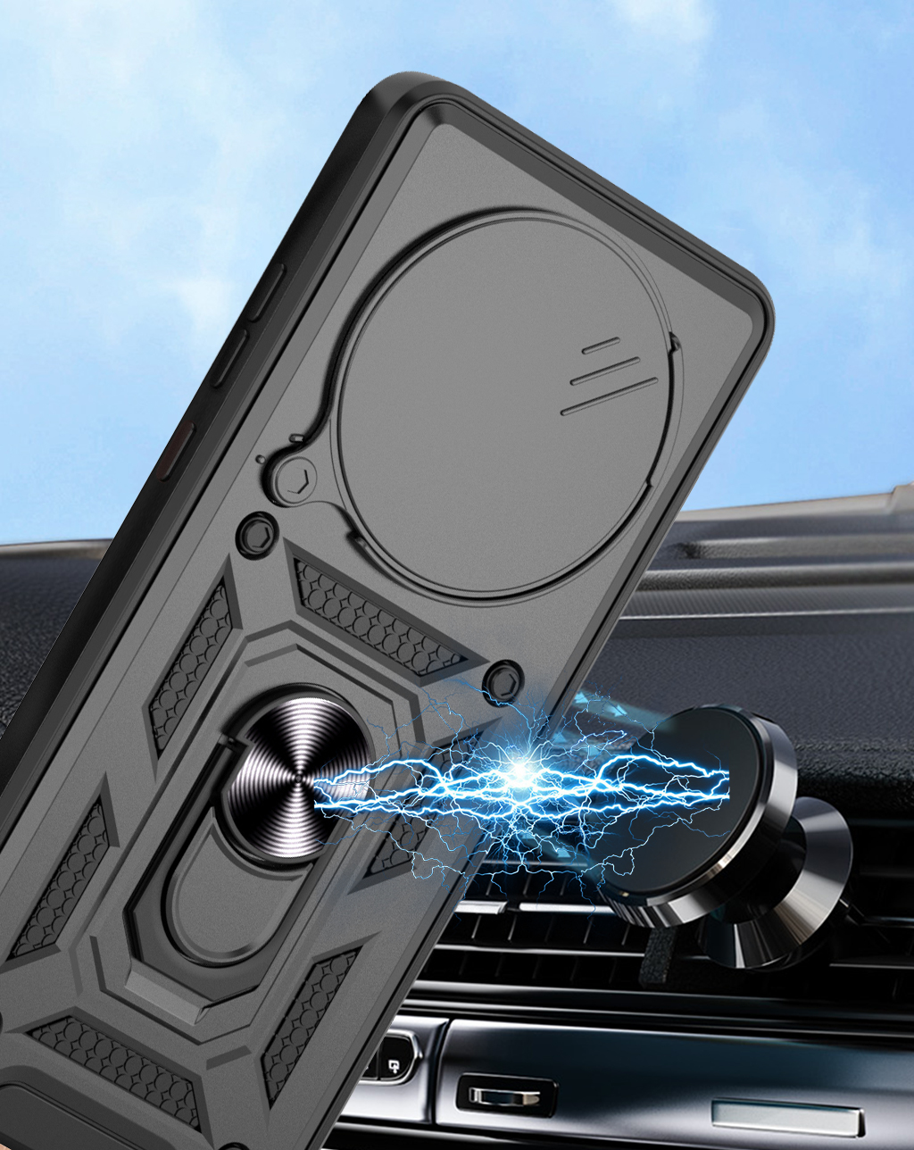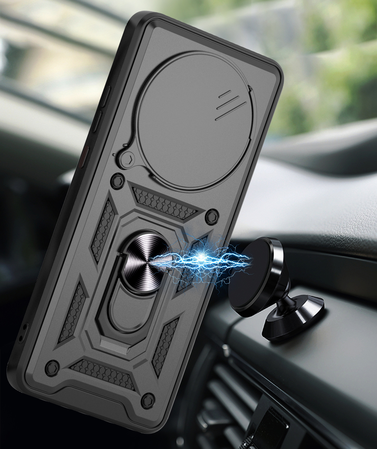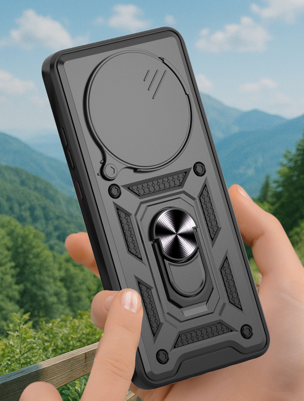 CAMSHIELD to etui, które zapewnia wysoki poziom ochrony połączony z nowoczesnym designem. Dwuwarstwowa konstrukcja z twardego poliwęglanu i elastycznego TPU zwiększa ochronę przed upadkami, zarysowaniami i codziennym zużyciem. Przesuwana osłona aparatu zabezpiecza soczewki przed uszkodzeniami i zabrudzeniami. Znajdujący się na pleckach metalowy ring z blaszką, pełni funkcję podstawki, uchwytu do wygodnego trzymania oraz mocowania do uchwytów magnetycznych w samochodzie. Zintegrowane przyciski chronią newralgiczne elementy telefonu, zachowując jednocześnie pełną funkcjonalność i wygodę użytkowania. Dodatkowo etui posiada dwie małe dziurki, umożliwiające przyczepienie smyczy lub zawieszki. To praktyczne rozwiązanie, które sprawdzi się zarówno na co dzień, jak i podczas wycieczek czy podróży.