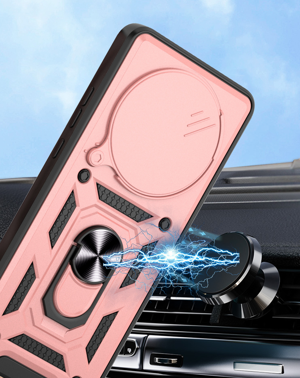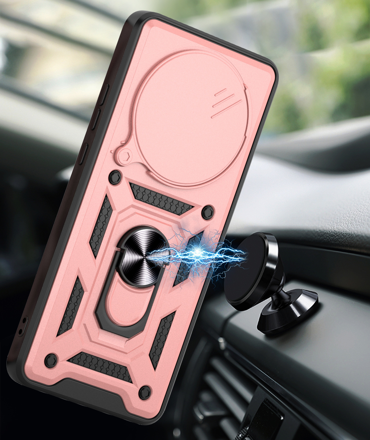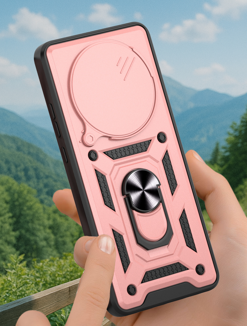CAMSHIELD to etui, które zapewnia wysoki poziom ochrony połączony z nowoczesnym designem. Dwuwarstwowa konstrukcja z twardego poliwęglanu i elastycznego TPU zwiększa ochronę przed upadkami, zarysowaniami i codziennym zużyciem. Przesuwana osłona aparatu zabezpiecza soczewki przed uszkodzeniami i zabrudzeniami. Znajdujący się na pleckach metalowy ring z blaszką, pełni funkcję podstawki, uchwytu do wygodnego trzymania oraz mocowania do uchwytów magnetycznych w samochodzie. Zintegrowane przyciski chronią newralgiczne elementy telefonu, zachowując jednocześnie pełną funkcjonalność i wygodę użytkowania. Dodatkowo etui posiada dwie małe dziurki, umożliwiające przyczepienie smyczy lub zawieszki. To praktyczne rozwiązanie, które sprawdzi się zarówno na co dzień, jak i podczas wycieczek czy podróży.