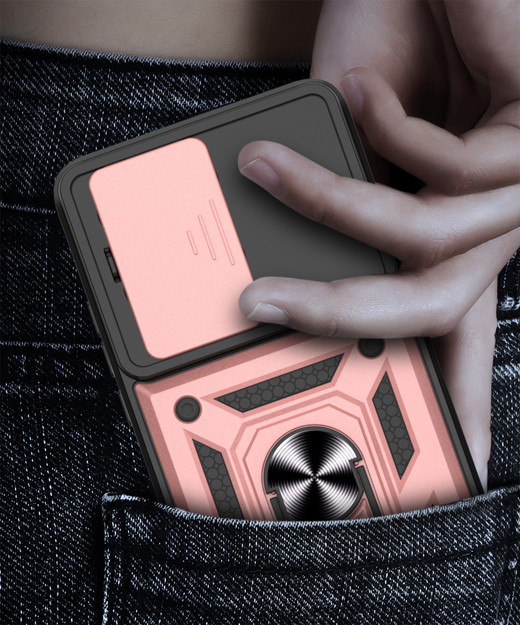 CAMSHIELD to etui, które zapewnia wysoki poziom ochrony połączony z nowoczesnym designem. Dwuwarstwowa konstrukcja z twardego poliwęglanu i elastycznego TPU zwiększa ochronę przed upadkami, zarysowaniami i codziennym zużyciem. Przesuwana osłona aparatu zabezpiecza soczewki przed uszkodzeniami i zabrudzeniami. Znajdujący się na pleckach metalowy ring z blaszką, pełni funkcję podstawki, uchwytu do wygodnego trzymania oraz mocowania do uchwytów magnetycznych w samochodzie. Zintegrowane przyciski chronią newralgiczne elementy telefonu, zachowując jednocześnie pełną funkcjonalność i wygodę użytkowania. Dodatkowo etui posiada dwie małe dziurki, umożliwiające przyczepienie smyczy lub zawieszki. To praktyczne rozwiązanie, które sprawdzi się zarówno na co dzień, jak i podczas wycieczek czy podróży.