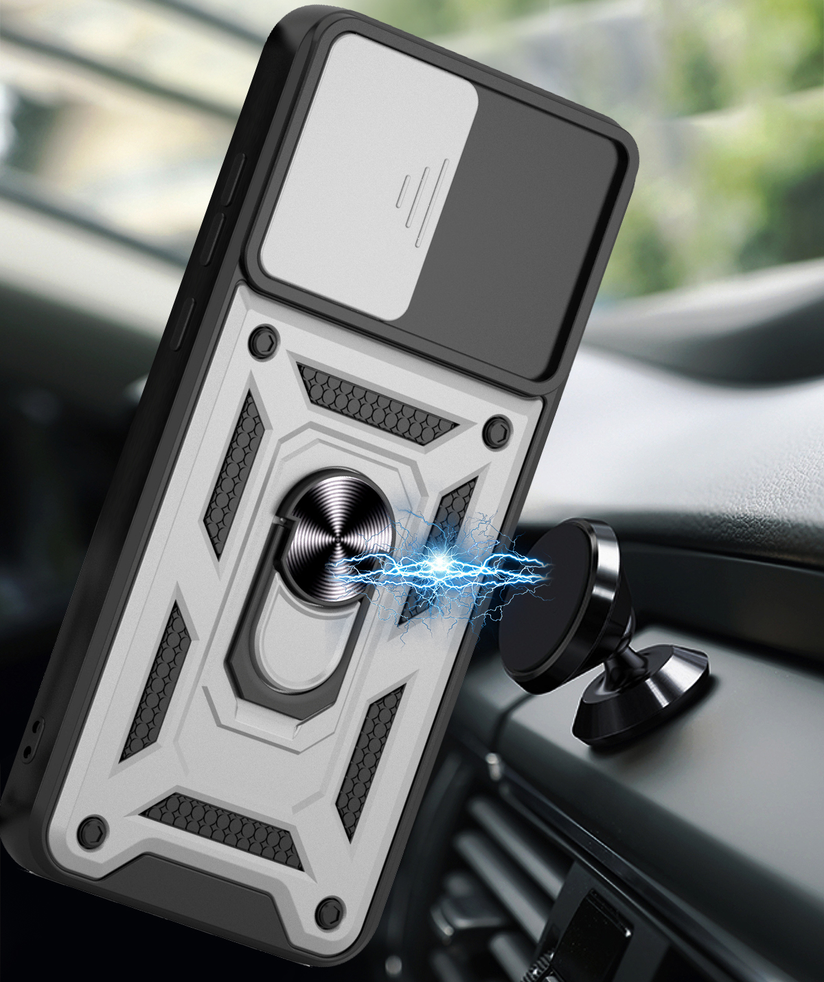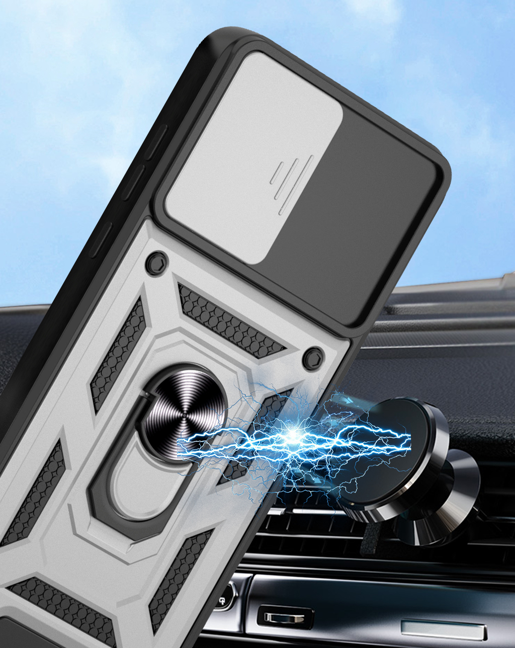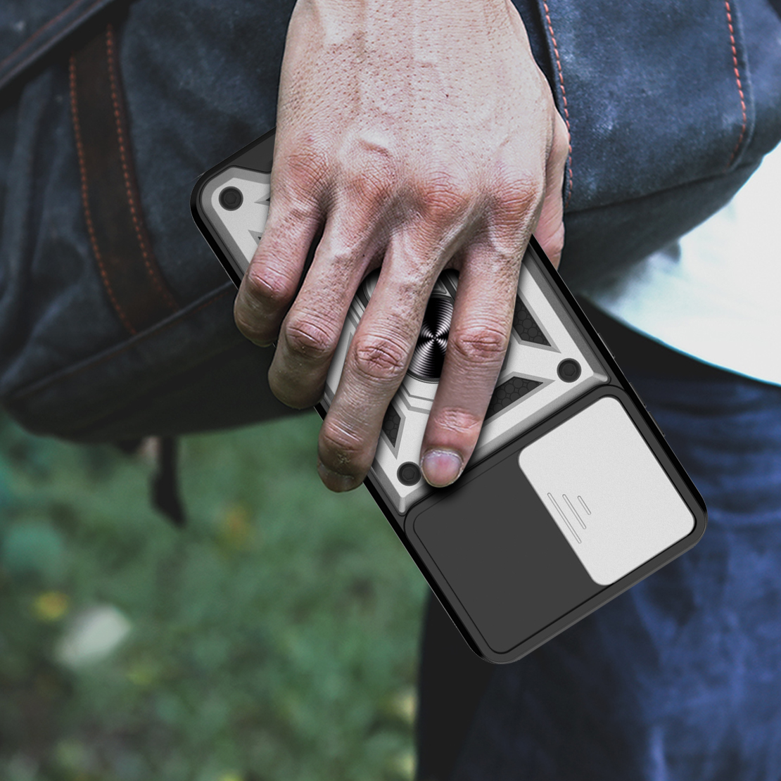 CAMSHIELD to etui, które zapewnia wysoki poziom ochrony połączony z nowoczesnym designem. Dwuwarstwowa konstrukcja z twardego poliwęglanu i elastycznego TPU zwiększa ochronę przed upadkami, zarysowaniami i codziennym zużyciem. Przesuwana osłona aparatu zabezpiecza soczewki przed uszkodzeniami i zabrudzeniami. Znajdujący się na pleckach metalowy ring z blaszką, pełni funkcję podstawki, uchwytu do wygodnego trzymania oraz mocowania do uchwytów magnetycznych w samochodzie. Zintegrowane przyciski chronią newralgiczne elementy telefonu, zachowując jednocześnie pełną funkcjonalność i wygodę użytkowania. Dodatkowo etui posiada dwie małe dziurki, umożliwiające przyczepienie smyczy lub zawieszki. To praktyczne rozwiązanie, które sprawdzi się zarówno na co dzień, jak i podczas wycieczek czy podróży.