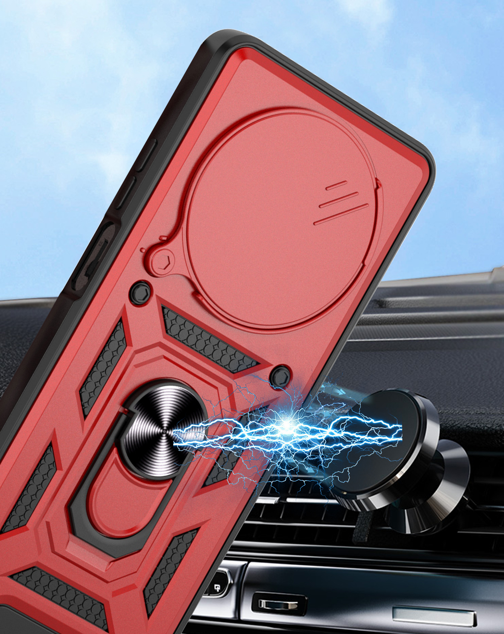 CAMSHIELD to etui, które zapewnia wysoki poziom ochrony połączony z nowoczesnym designem. Dwuwarstwowa konstrukcja z twardego poliwęglanu i elastycznego TPU zwiększa ochronę przed upadkami, zarysowaniami i codziennym zużyciem. Przesuwana osłona aparatu zabezpiecza soczewki przed uszkodzeniami i zabrudzeniami. Znajdujący się na pleckach metalowy ring z blaszką, pełni funkcję podstawki, uchwytu do wygodnego trzymania oraz mocowania do uchwytów magnetycznych w samochodzie. Zintegrowane przyciski chronią newralgiczne elementy telefonu, zachowując jednocześnie pełną funkcjonalność i wygodę użytkowania. Dodatkowo etui posiada dwie małe dziurki, umożliwiające przyczepienie smyczy lub zawieszki. To praktyczne rozwiązanie, które sprawdzi się zarówno na co dzień, jak i podczas wycieczek czy podróży.