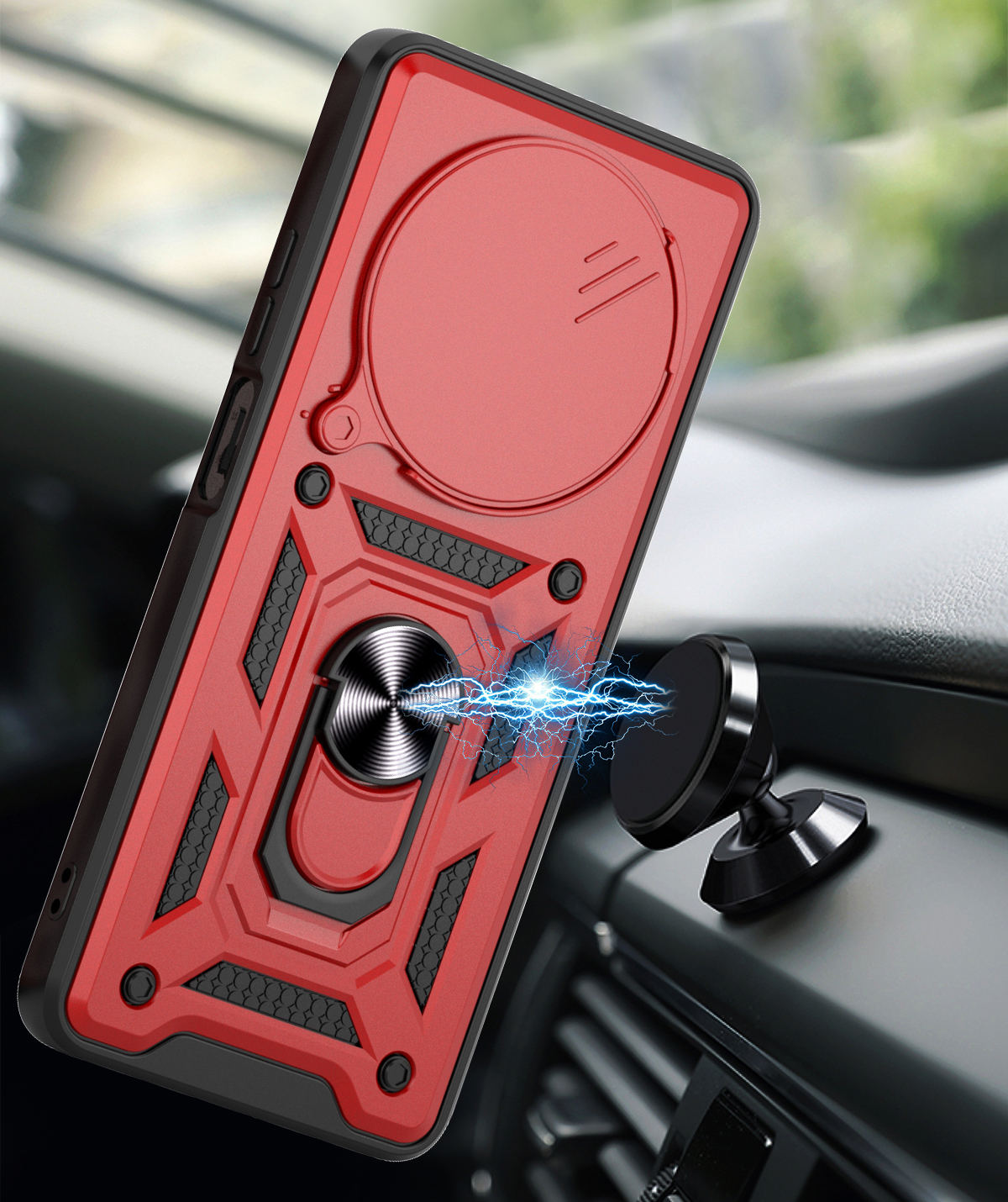 Wbudowana metalowa blaszka sprawia, że etui można łatwo zamocować do magnetycznych uchwytów samochodowych. Eliminuje to konieczność stosowania dodatkowych płytek montażowych, które często psują wygląd urządzenia.