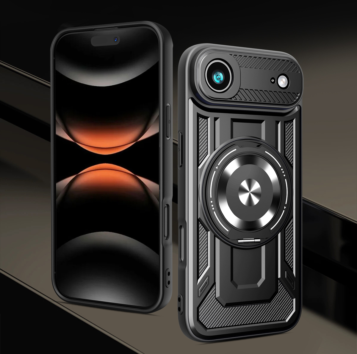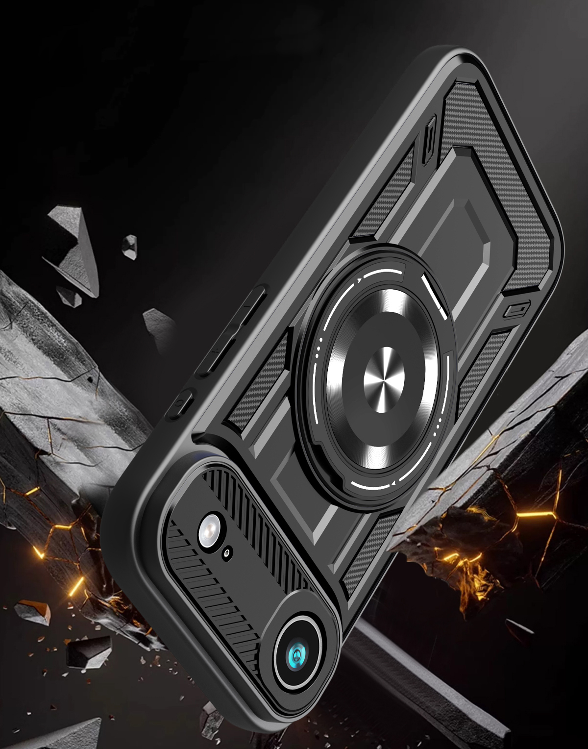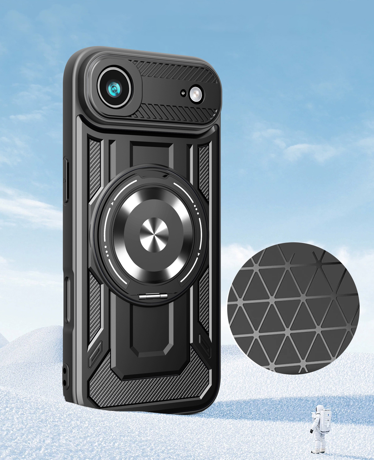 - Duży otwierany RING kompatybilny z uchwytami MAGSAFE, który może służyć jako podstawka.