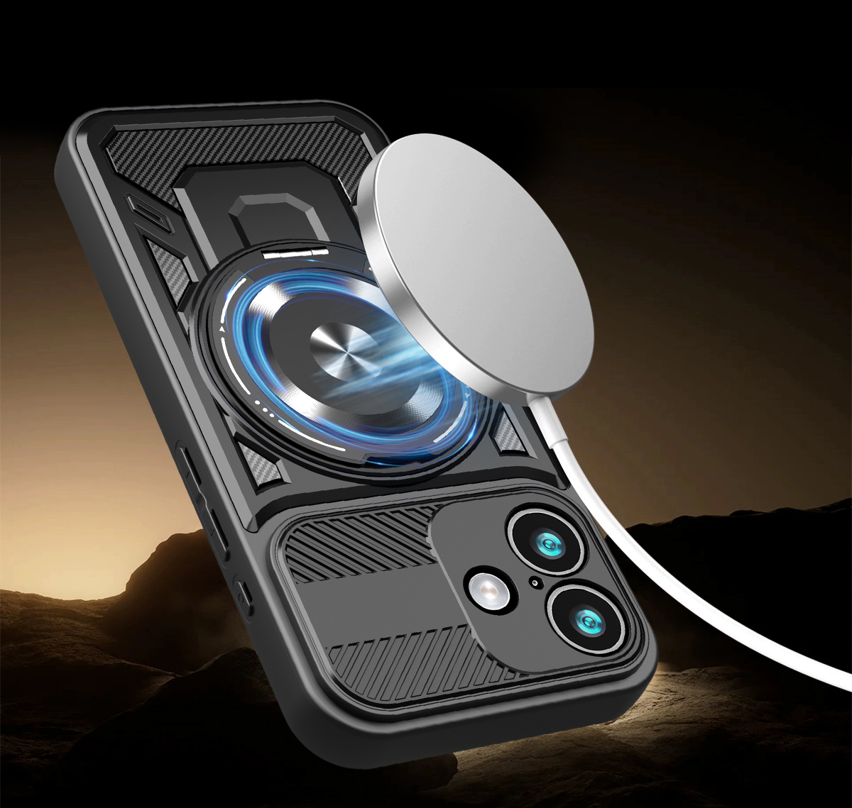 - Duży otwierany RING kompatybilny z uchwytami MAGSAFE, który może służyć jako podstawka.