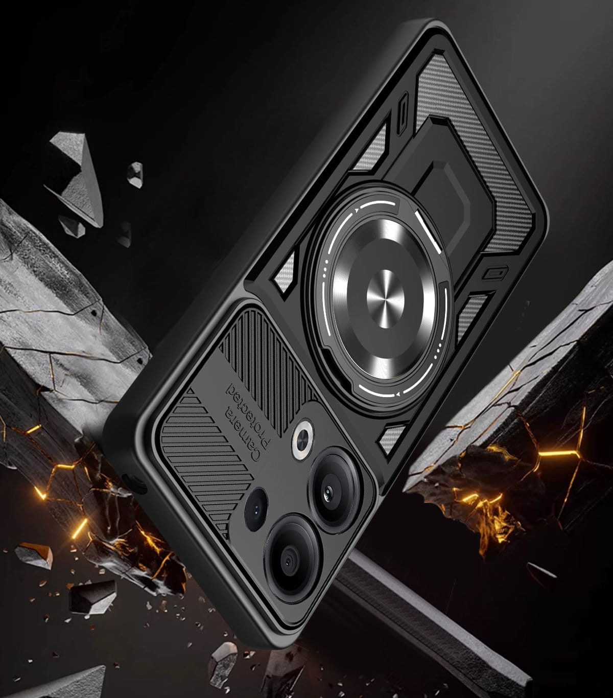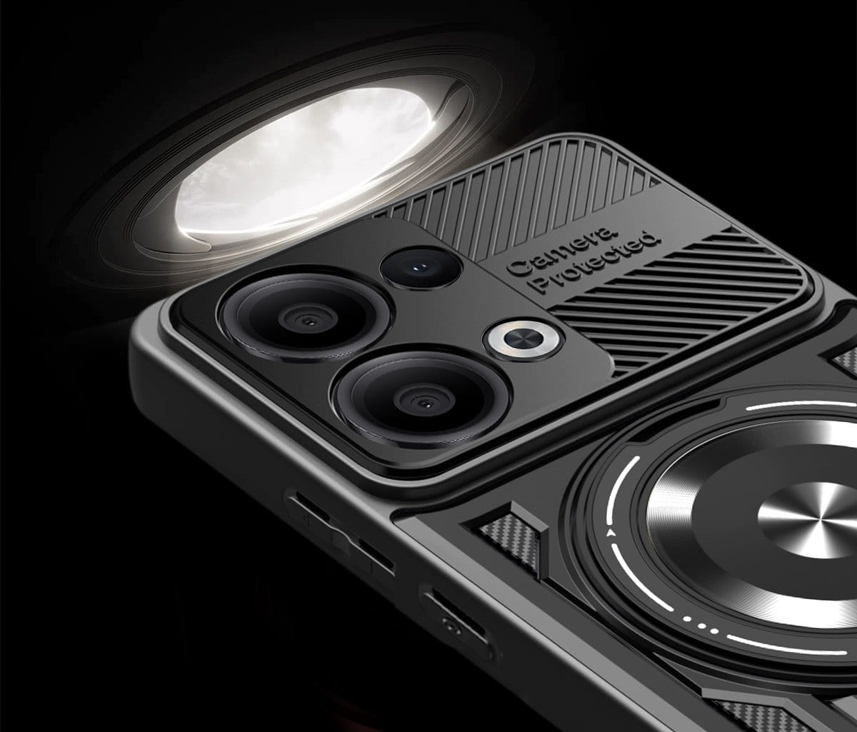 - Duży otwierany RING kompatybilny z uchwytami MAGSAFE, który może służyć jako podstawka.