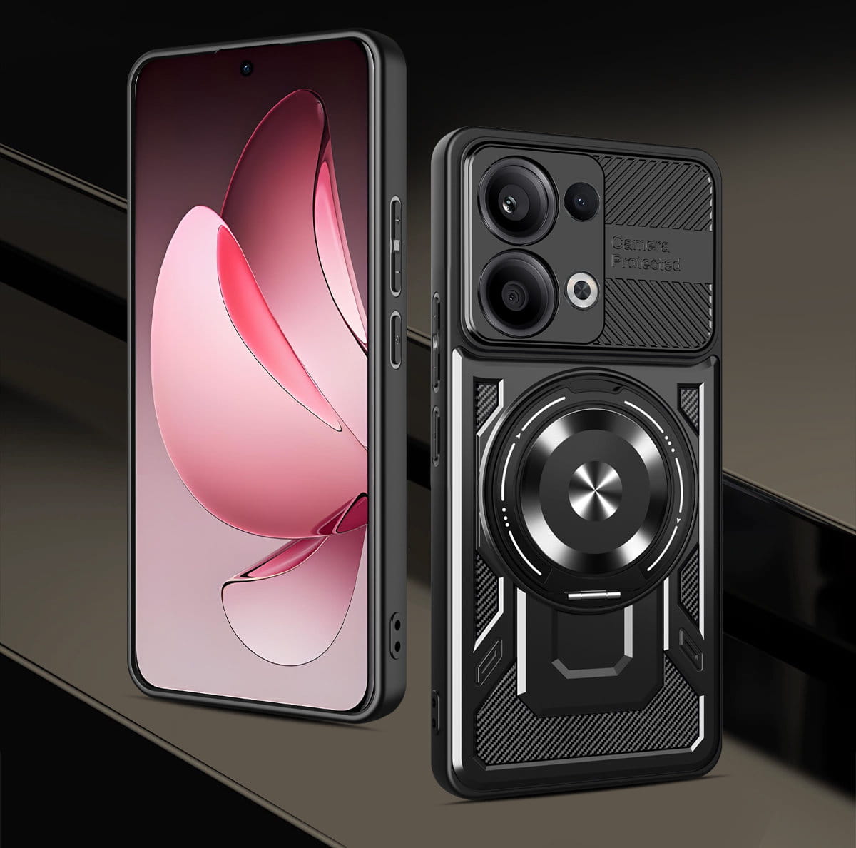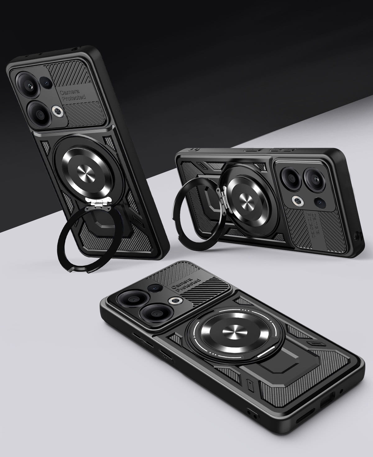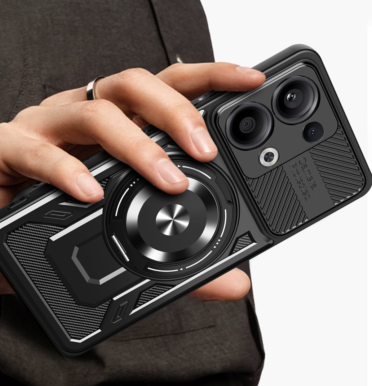 - Duży otwierany RING kompatybilny z uchwytami MAGSAFE, który może służyć jako podstawka.