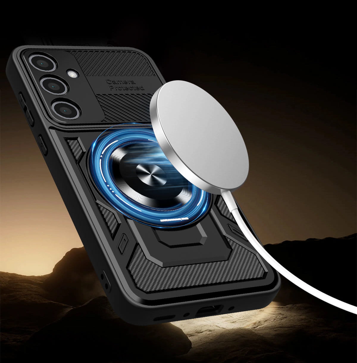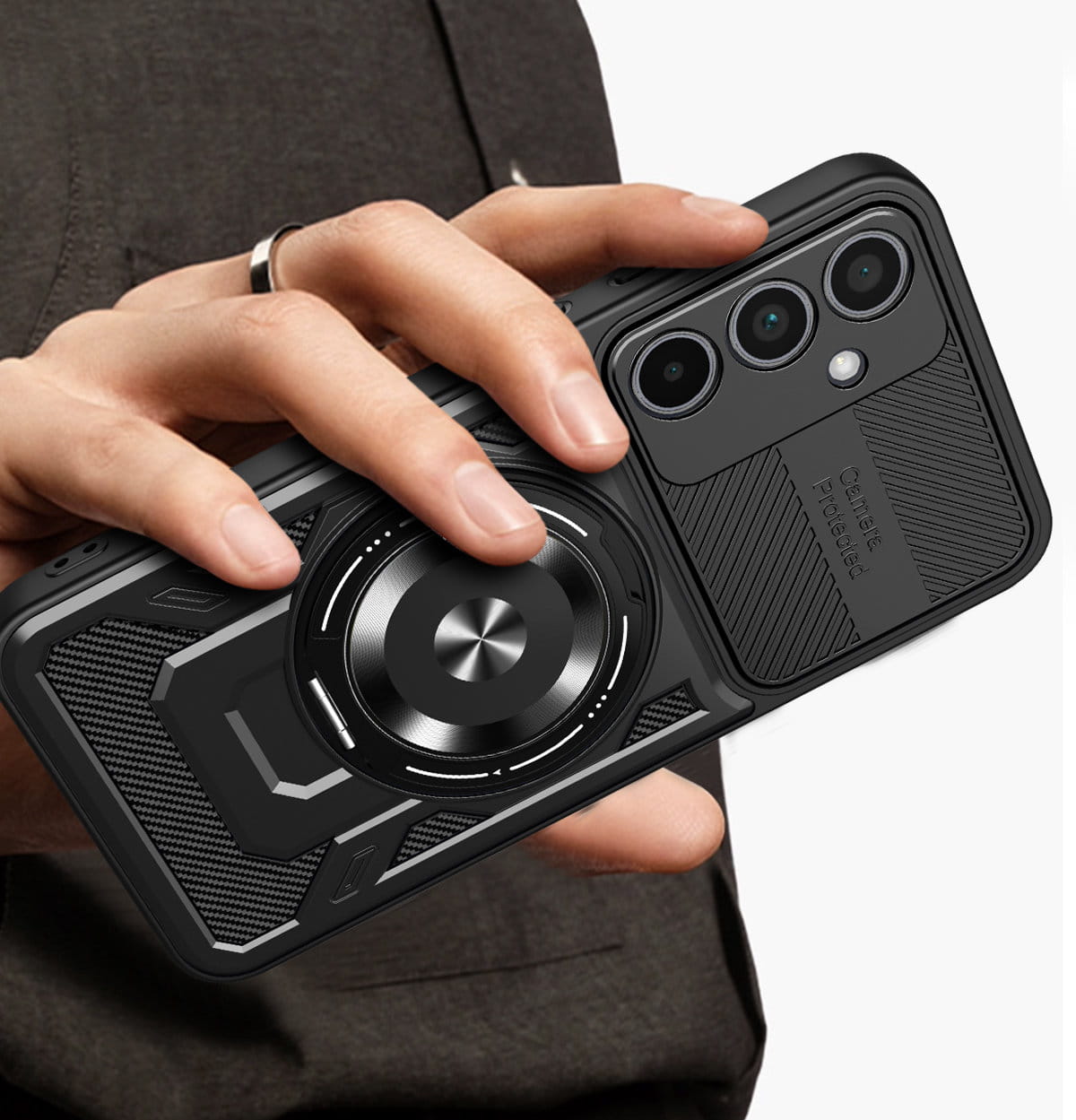 - Duży otwierany RING kompatybilny z uchwytami MAGSAFE, który może służyć jako podstawka.