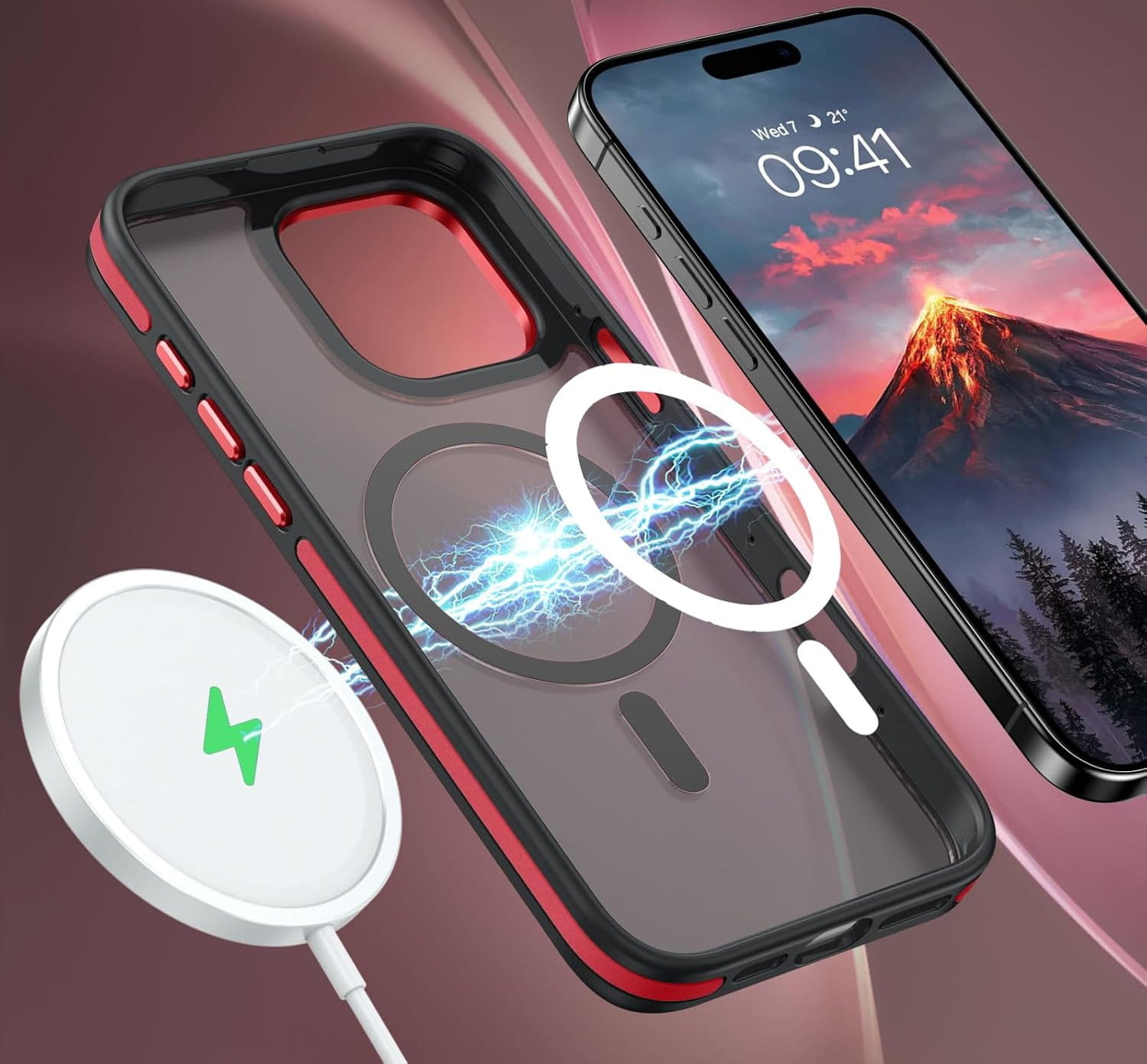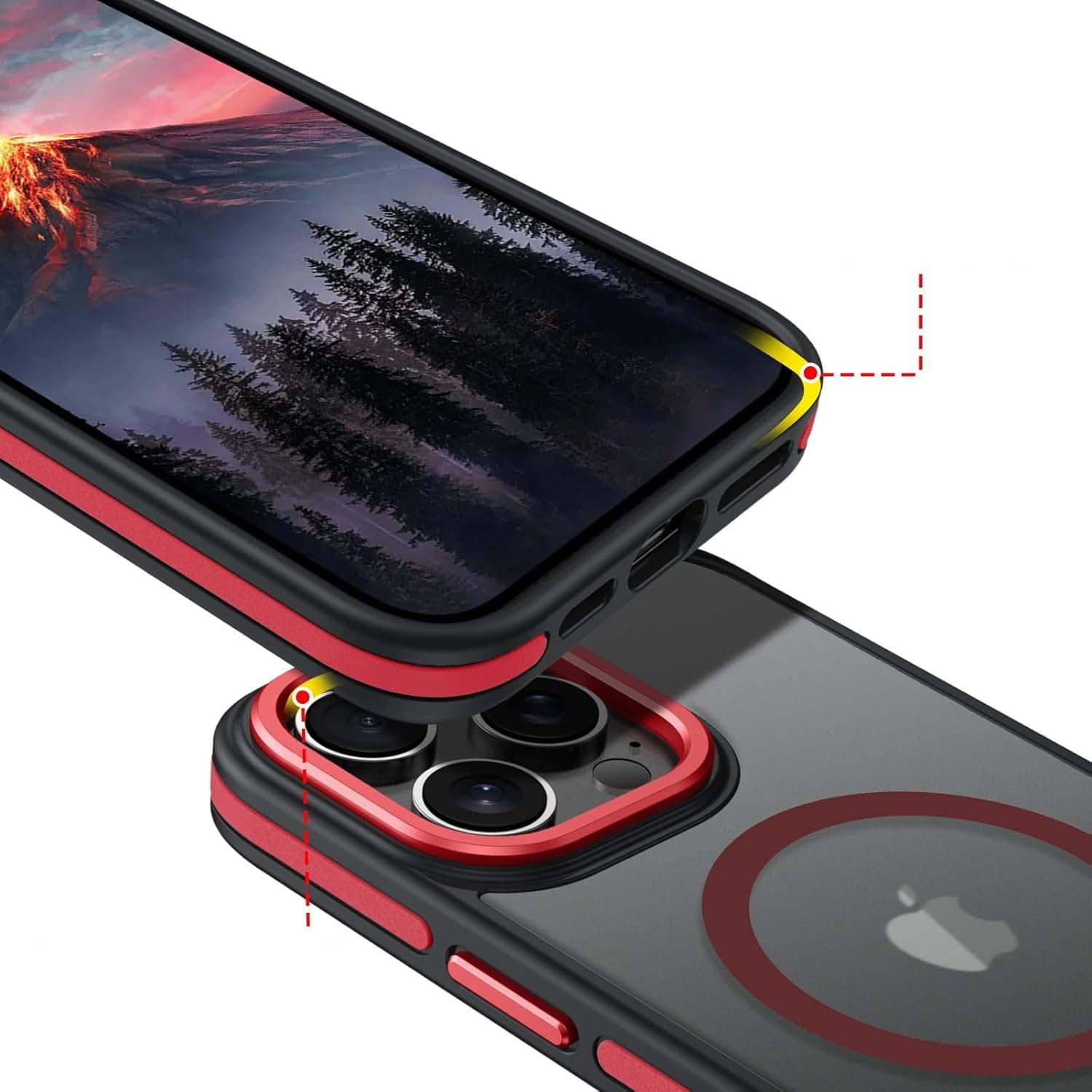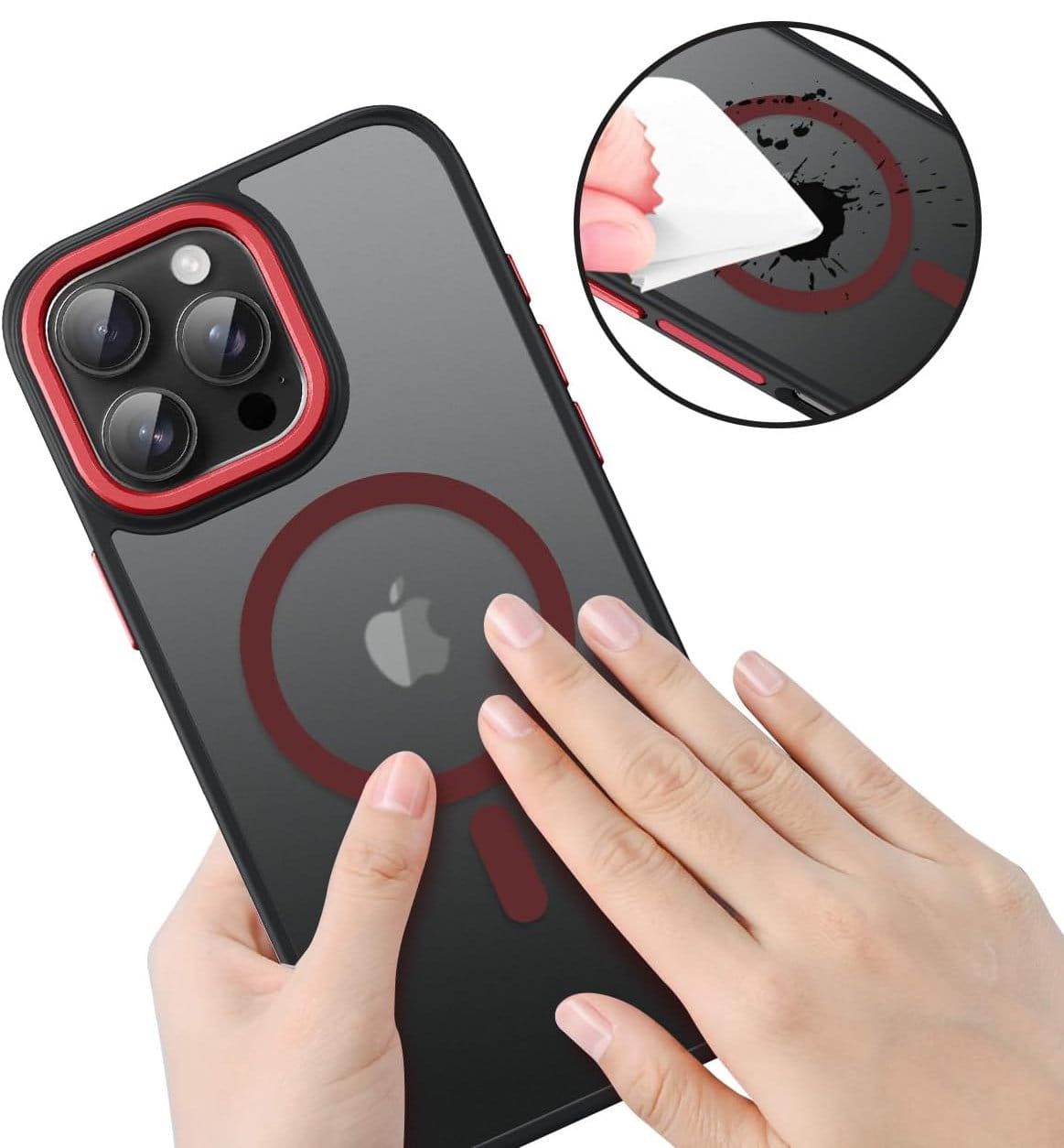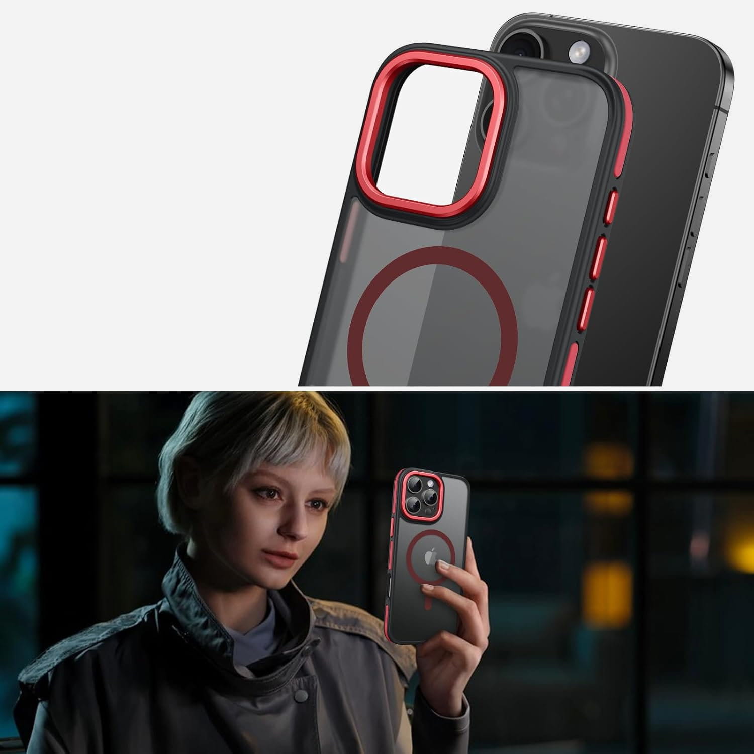 Ochronne etui składające się z dwóch materiałów: TPU (utwardzana guma) - ramka oraz twardego poliwęglanu, pokrytego warstwą antypoślizgową - matowe plecy. Zapewnia to świetną ochronę przy zachowaniu pełnej funkcjonalności. Etui umożliwia także współpracę z akcesoriami MAGSAFE.