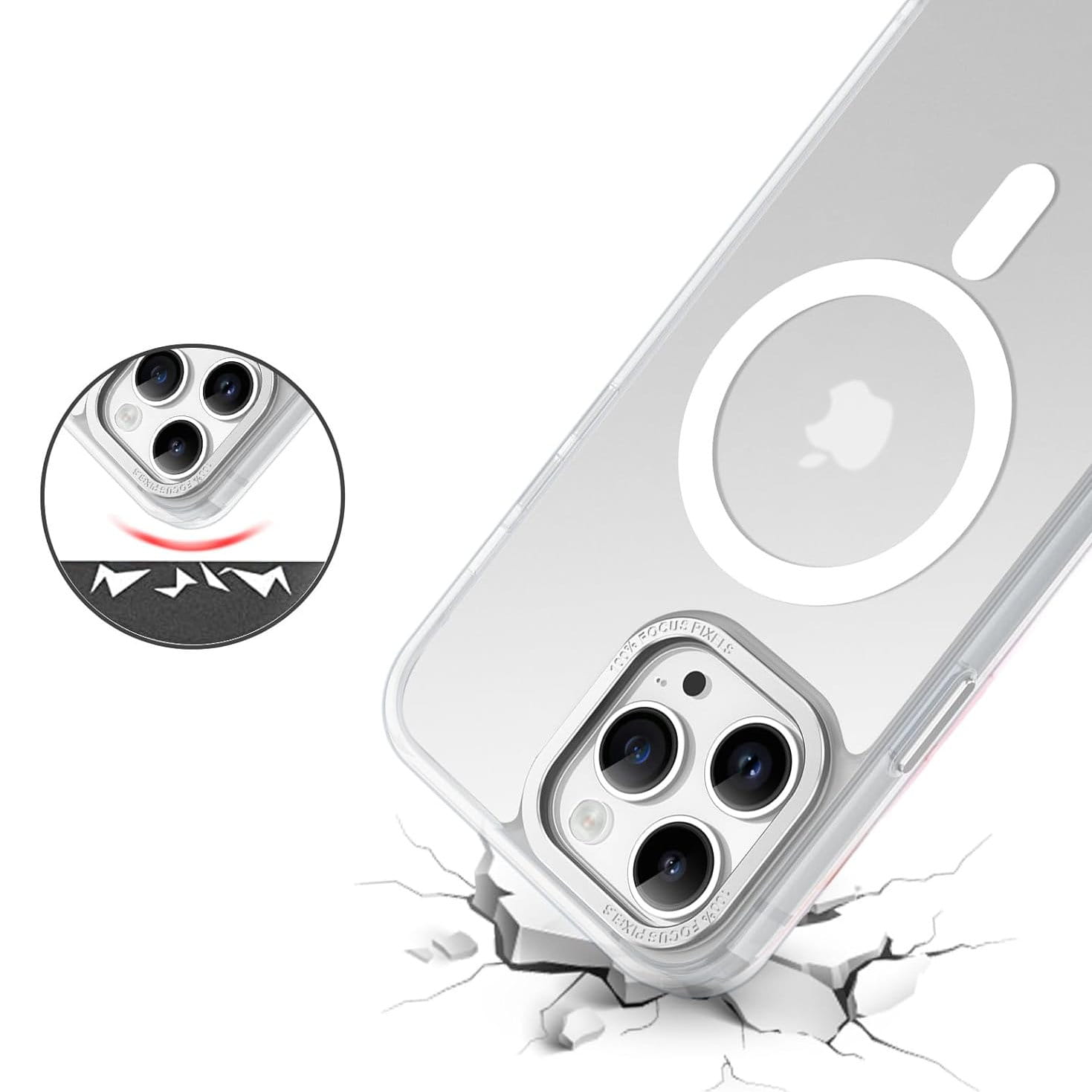 Ochronne etui składające się z dwóch materiałów: TPU (utwardzana guma) - ramka oraz twardego poliwęglanu, pokrytego warstwą antypoślizgową - matowe plecy. Zapewnia to świetną ochronę przy zachowaniu pełnej funkcjonalności. Etui umożliwia także współpracę z akcesoriami MAGSAFE.