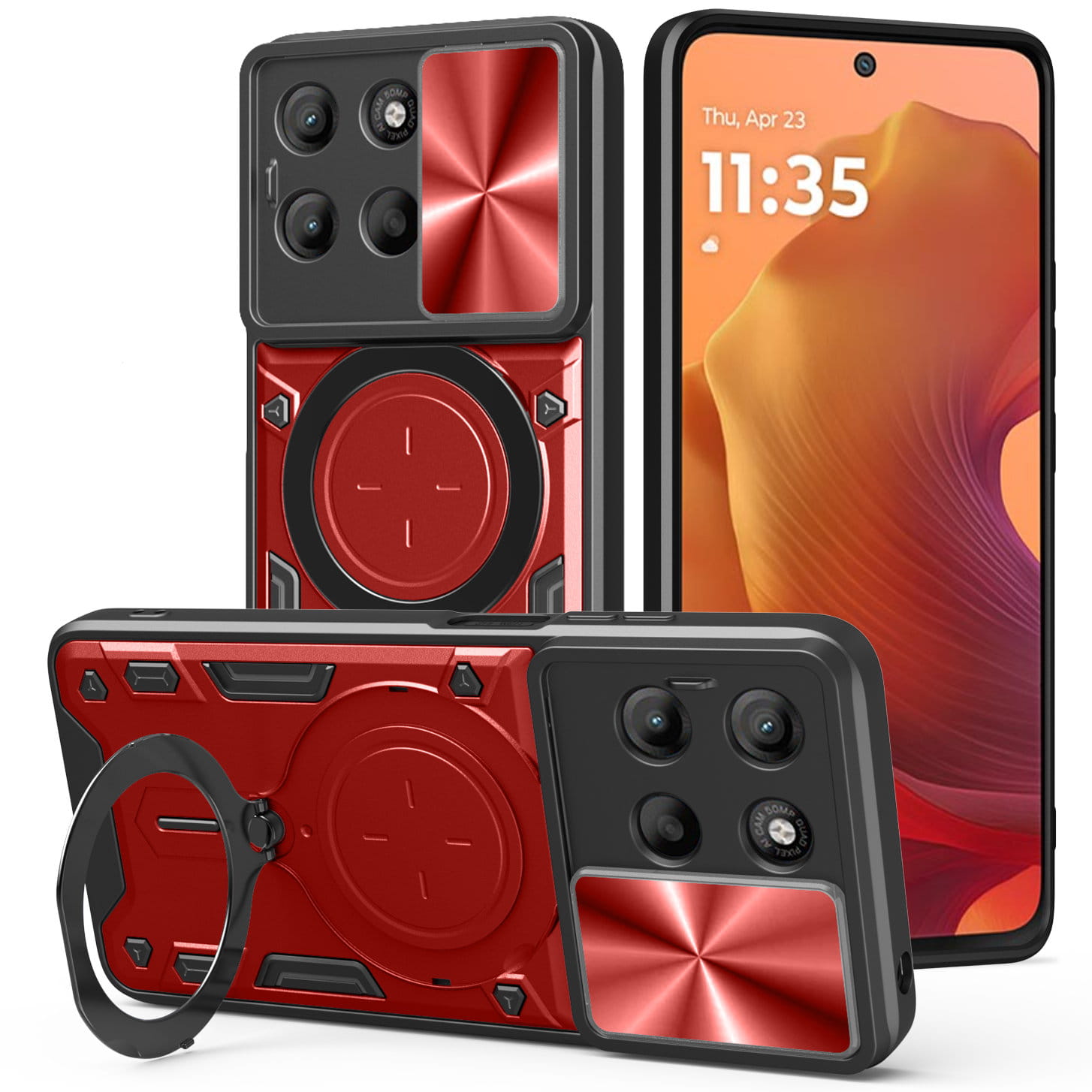 Przesuwana osłona na plecach zabezpiecza obiektywy aparatu przed zarysowaniami i zabrudzeniami. Przesuwanie działa płynnie umożliwiając szybkie odsłonięcie lub zakrycie obiektywów jednym ruchem palca. Jest to rozwiązanie, które łączy estetykę z praktyczną ochroną. Natomiast wysoki rant wokół aparatu zwiększa ochronę przy położeniu telefonu na płaskiej powierzchni lub upadku, nawet gdy osłona jest otwarta.