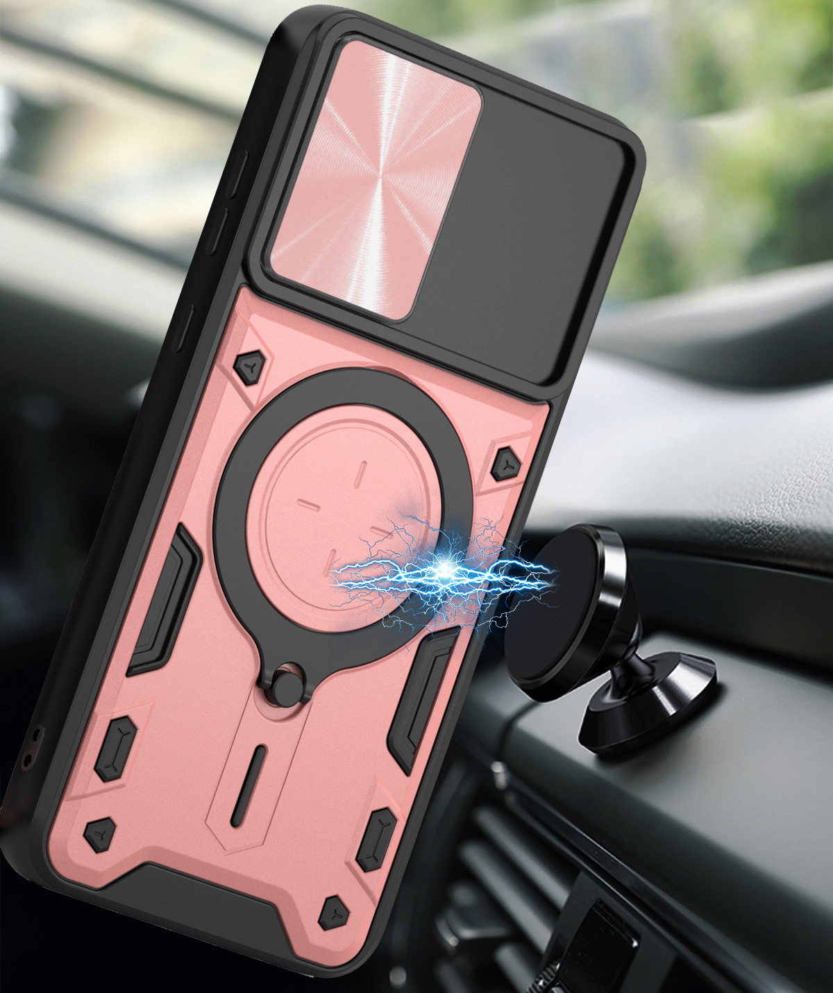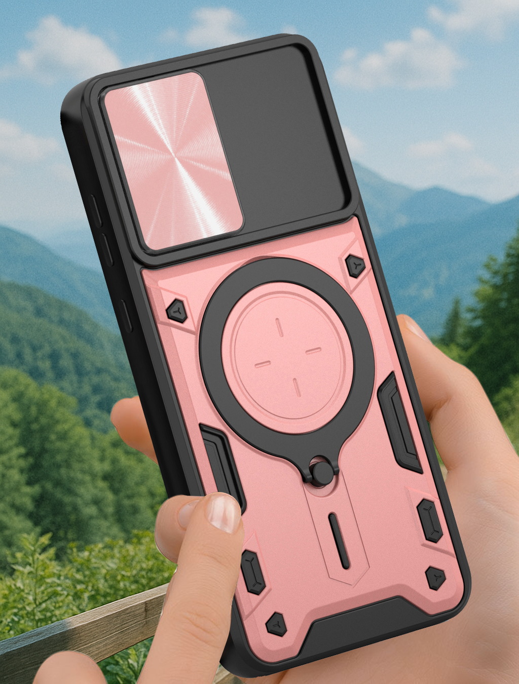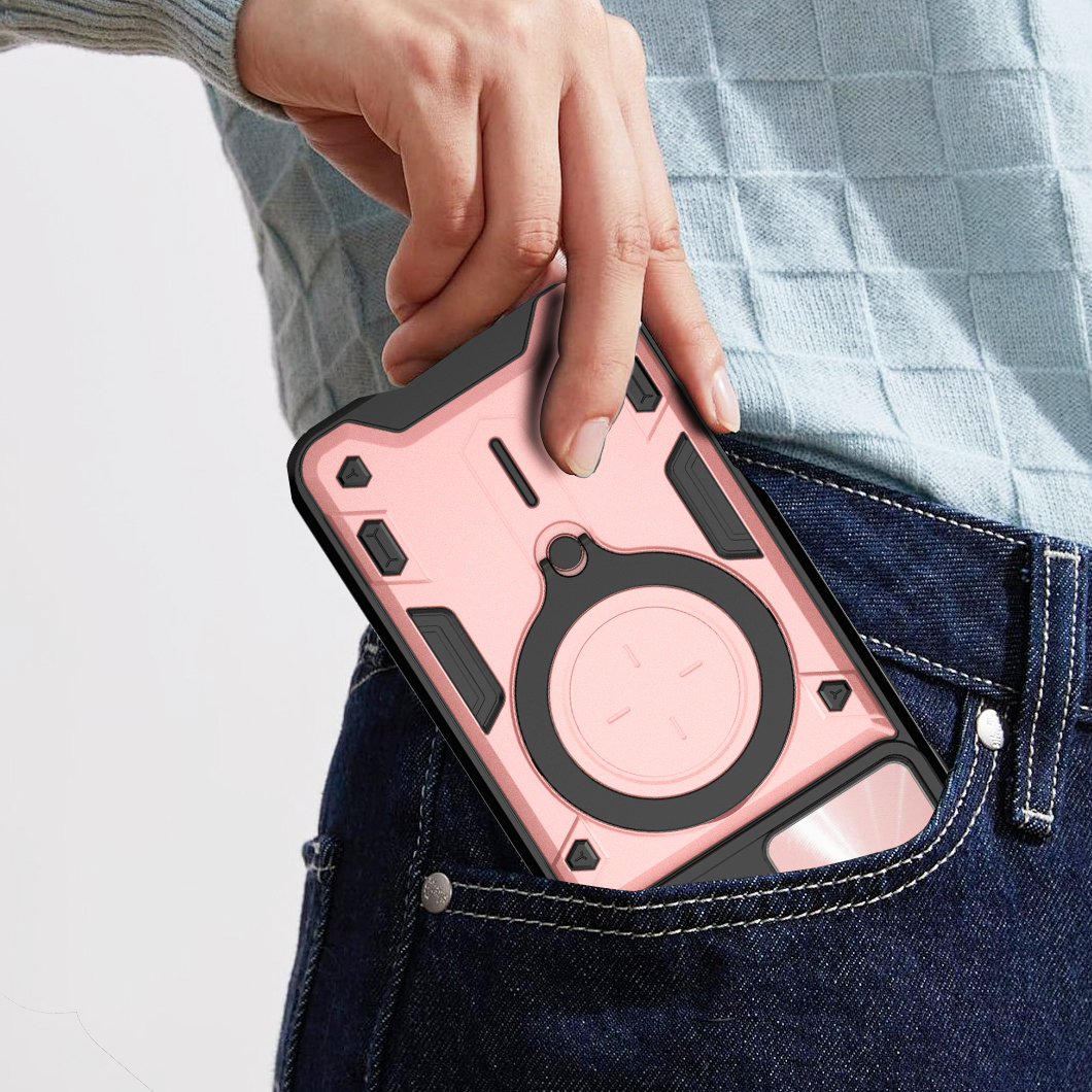 RINGSHIELD to etui, które zapewnia wysoki poziom ochrony połączony z nowoczesnym designem. Dwuwarstwowa konstrukcja z twardego poliwęglanu i elastycznego TPU zwiększa ochronę przed upadkami, zarysowaniami i codziennym zużyciem. Przesuwana osłona aparatu zabezpiecza soczewki przed uszkodzeniami i zabrudzeniami. Znajdujący się na pleckach metalowy ring z blaszką, pełni funkcję podstawki, uchwytu do wygodnego trzymania oraz mocowania do uchwytów magnetycznych w samochodzie. Zintegrowane przyciski chronią newralgiczne elementy telefonu, zachowując jednocześnie pełną funkcjonalność i wygodę użytkowania. Dodatkowo etui posiada dwie małe dziurki, umożliwiające przyczepienie smyczy lub zawieszki. To praktyczne rozwiązanie, które sprawdzi się zarówno na co dzień, jak i podczas wycieczek czy podróży.
