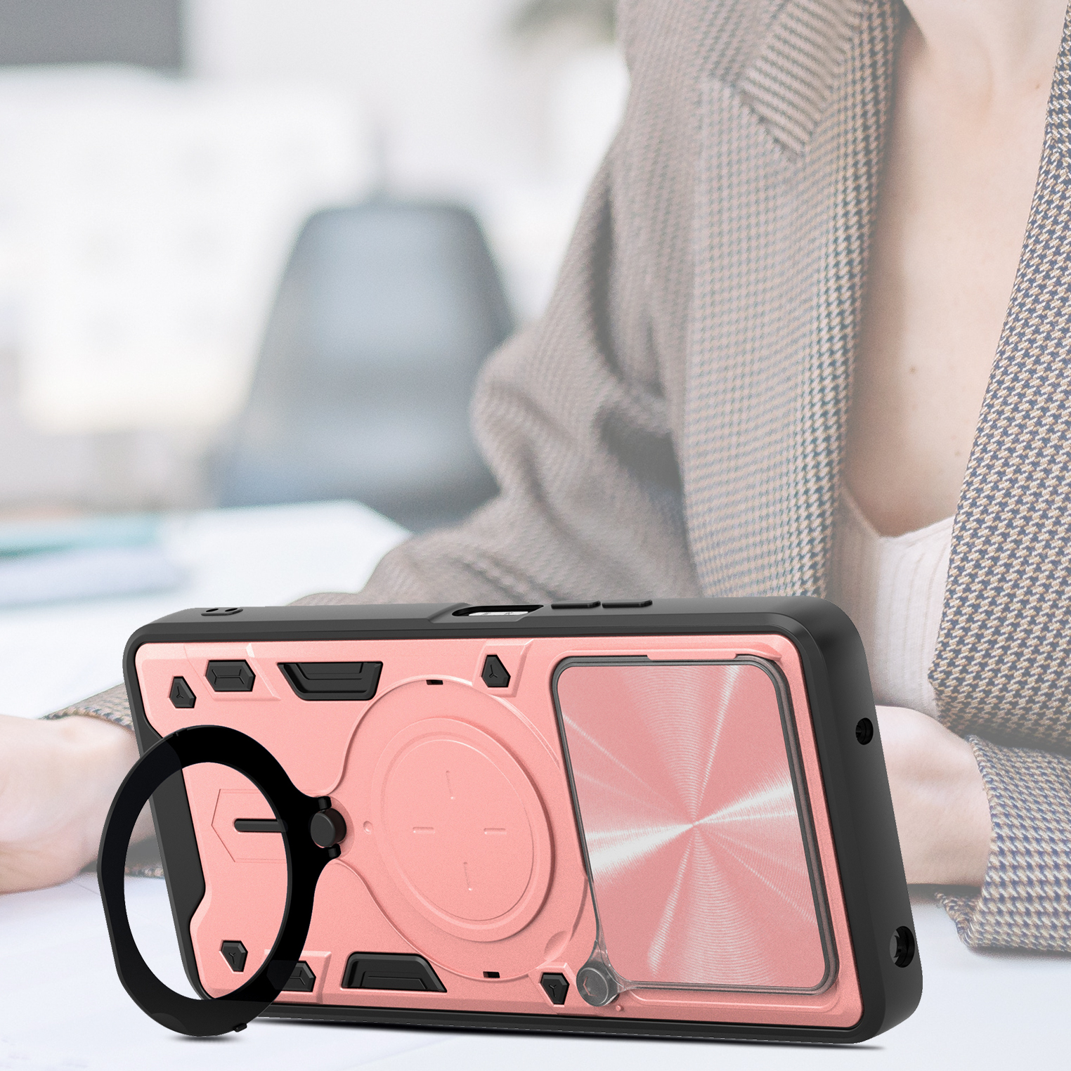 Etui zostało zaprojektowane z myślą o kompleksowej ochronie urządzenia w codziennym użytkowaniu oraz w trudniejszych warunkach. Dzięki zastosowaniu dwuwarstwowej konstrukcji – twardej zewnętrznej powłoki z poliwęglanu (PC) oraz wewnętrznej warstwy z elastycznego TPU – skutecznie zmniejsza ryzyko uszkodzeń telefonu. Struktura materiału, wbudowany ring oraz antypoślizgowe detale ograniczają ryzyko wyślizgnięcia się telefonu z dłoni.