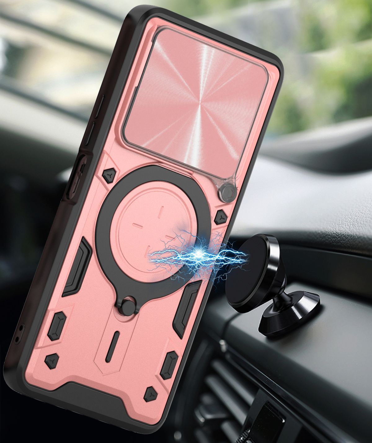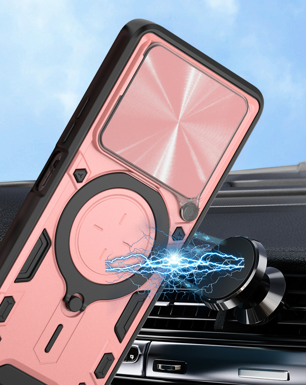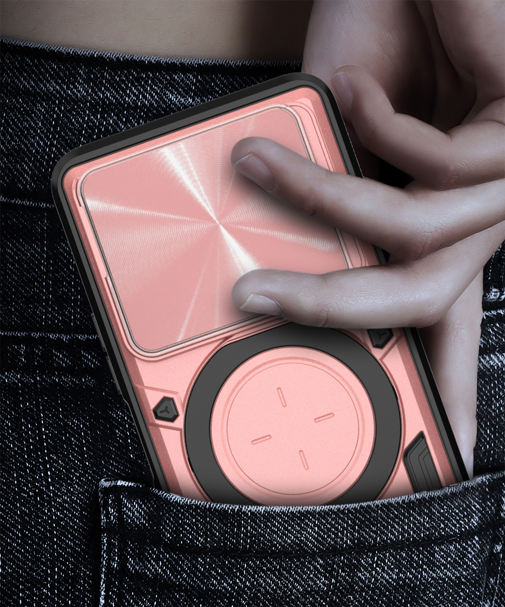 RINGSHIELD to etui, które zapewnia wysoki poziom ochrony połączony z nowoczesnym designem. Dwuwarstwowa konstrukcja z twardego poliwęglanu i elastycznego TPU zwiększa ochronę przed upadkami, zarysowaniami i codziennym zużyciem. Przesuwana osłona aparatu zabezpiecza soczewki przed uszkodzeniami i zabrudzeniami. Znajdujący się na pleckach metalowy ring z blaszką, pełni funkcję podstawki, uchwytu do wygodnego trzymania oraz mocowania do uchwytów magnetycznych w samochodzie. Zintegrowane przyciski chronią newralgiczne elementy telefonu, zachowując jednocześnie pełną funkcjonalność i wygodę użytkowania. Dodatkowo etui posiada dwie małe dziurki, umożliwiające przyczepienie smyczy lub zawieszki. To praktyczne rozwiązanie, które sprawdzi się zarówno na co dzień, jak i podczas wycieczek czy podróży.