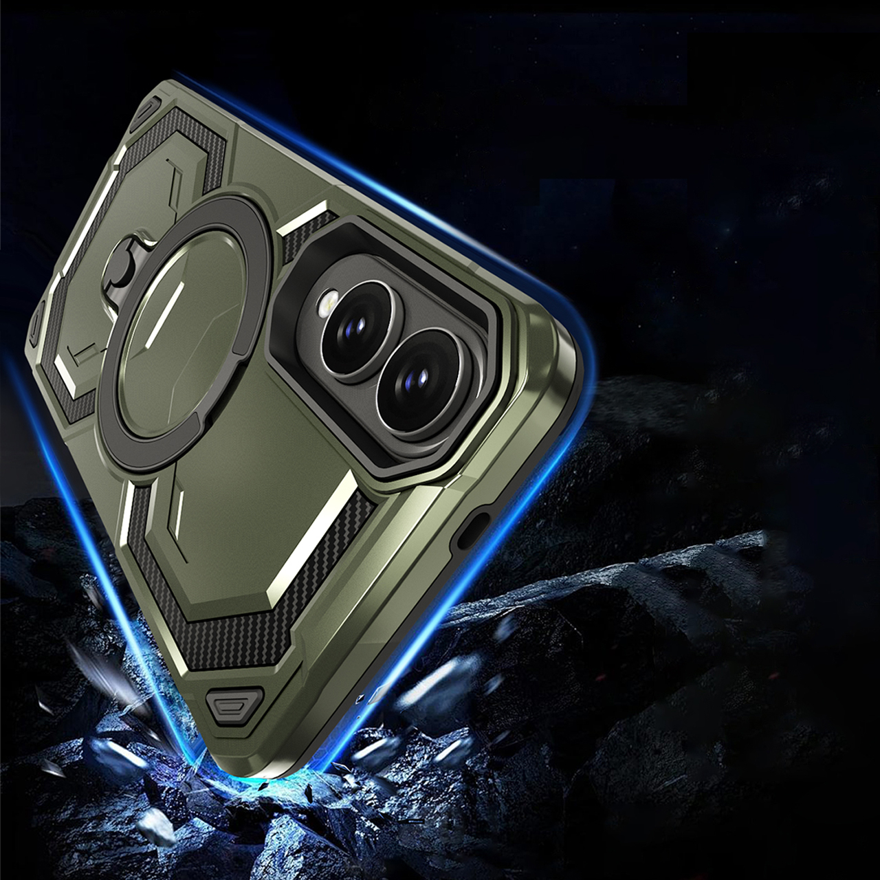 - Duży otwierany RING kompatybilny z uchwytami MAGSAFE, który może służyć jako podstawka.
