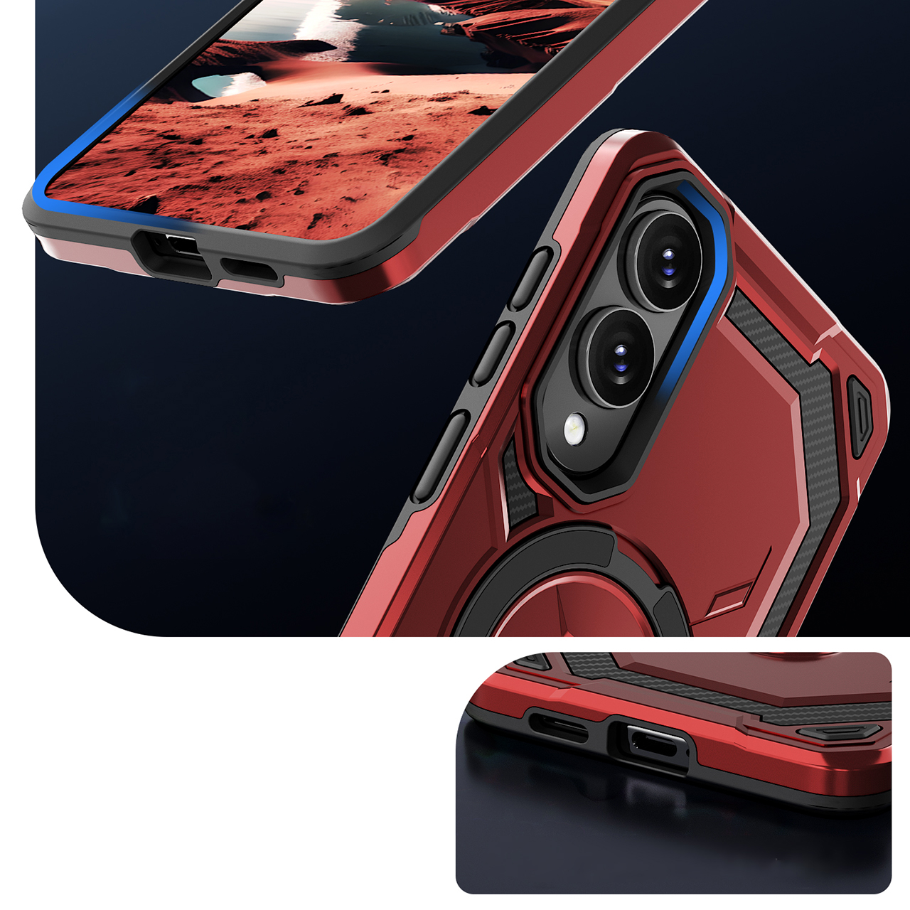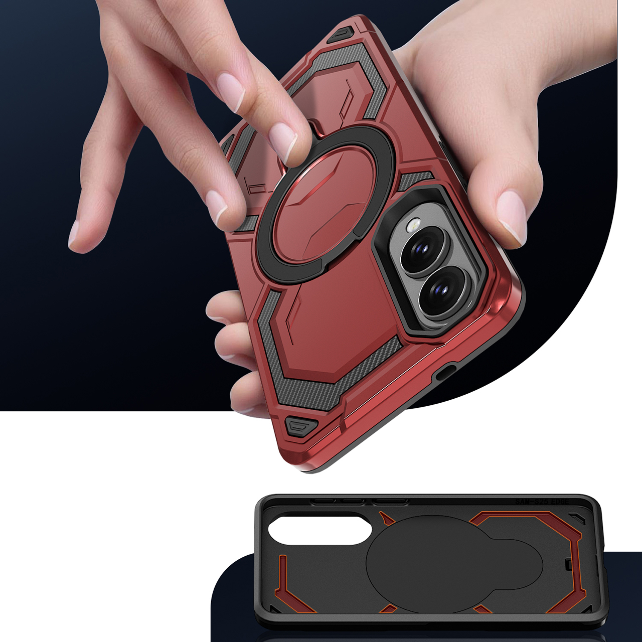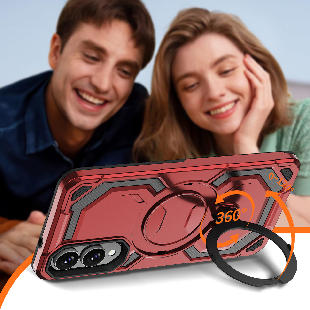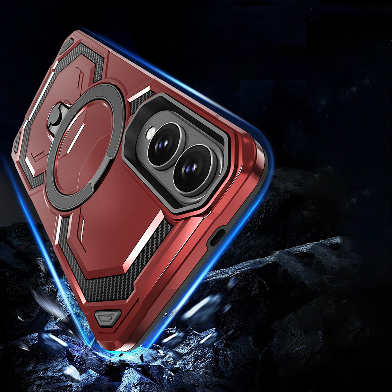 - Duży otwierany RING kompatybilny z uchwytami MAGSAFE, który może służyć jako podstawka.